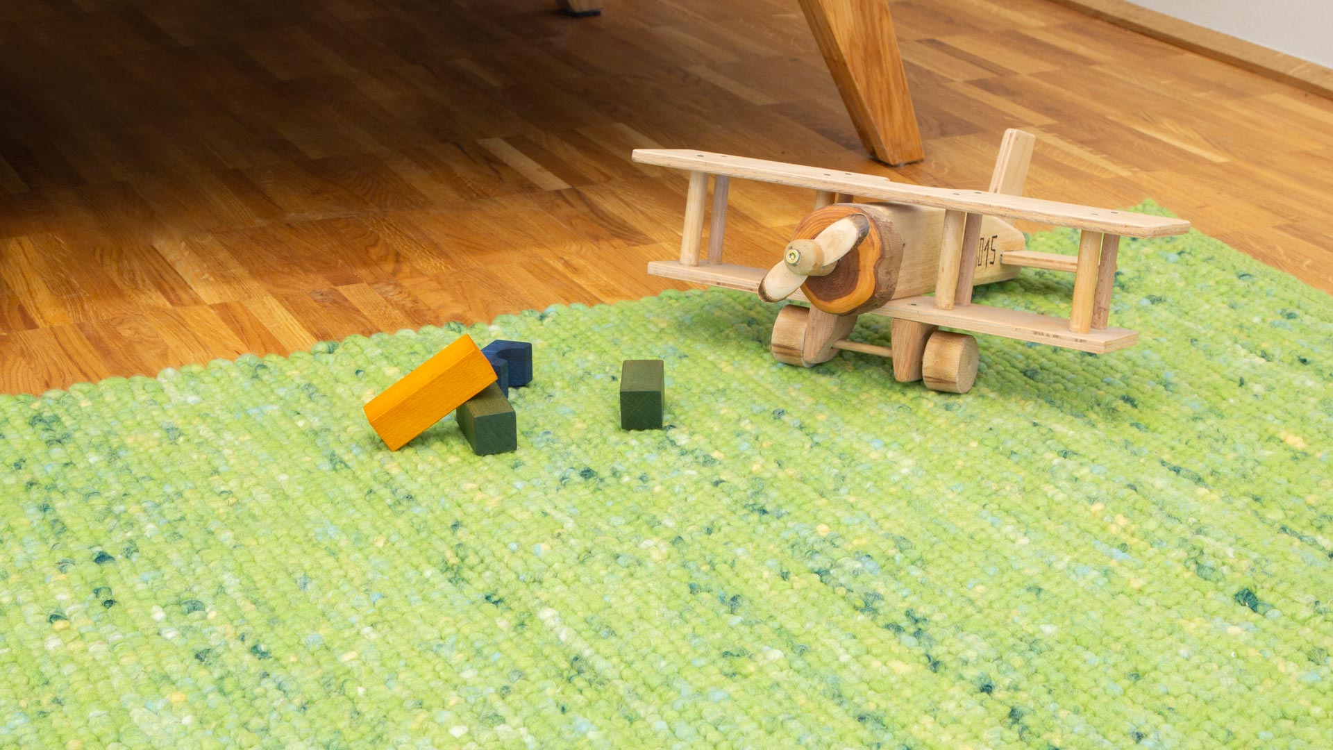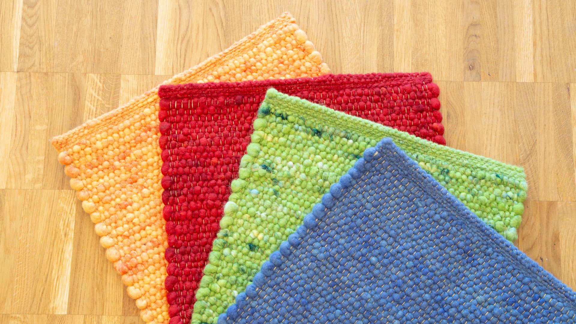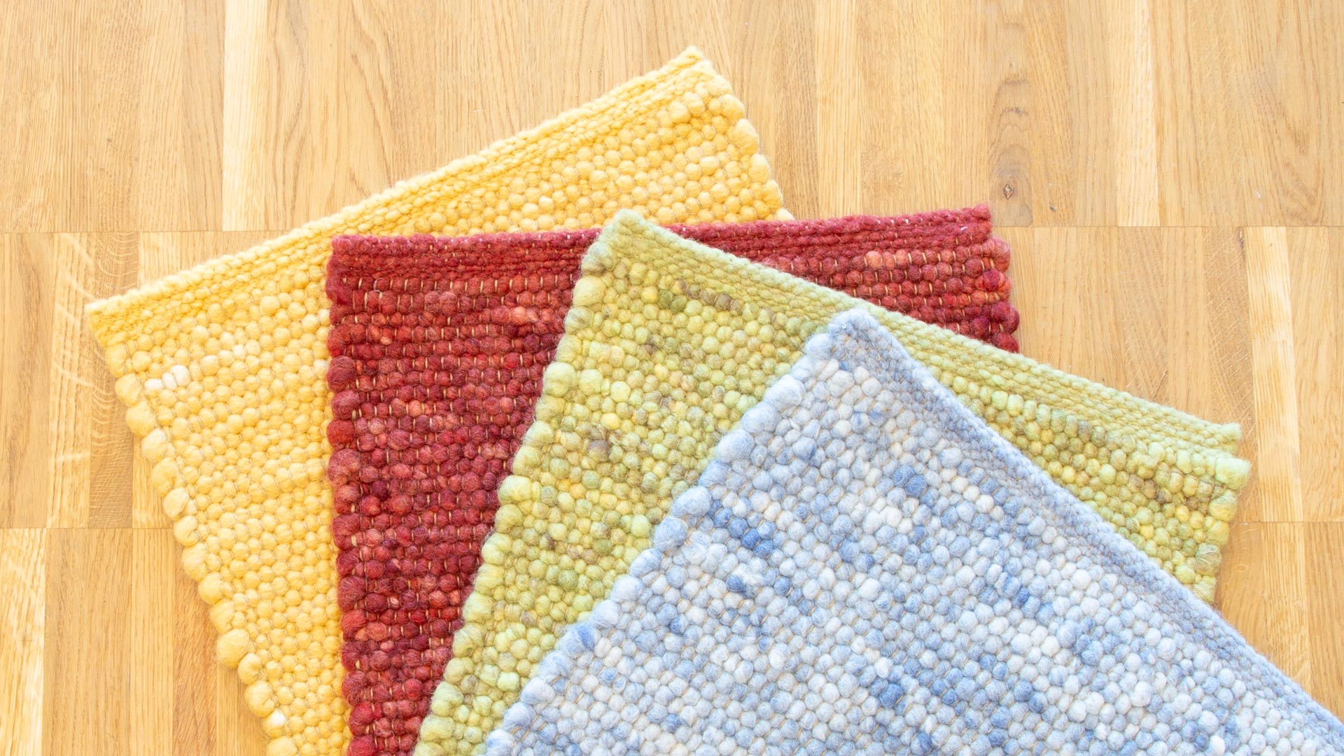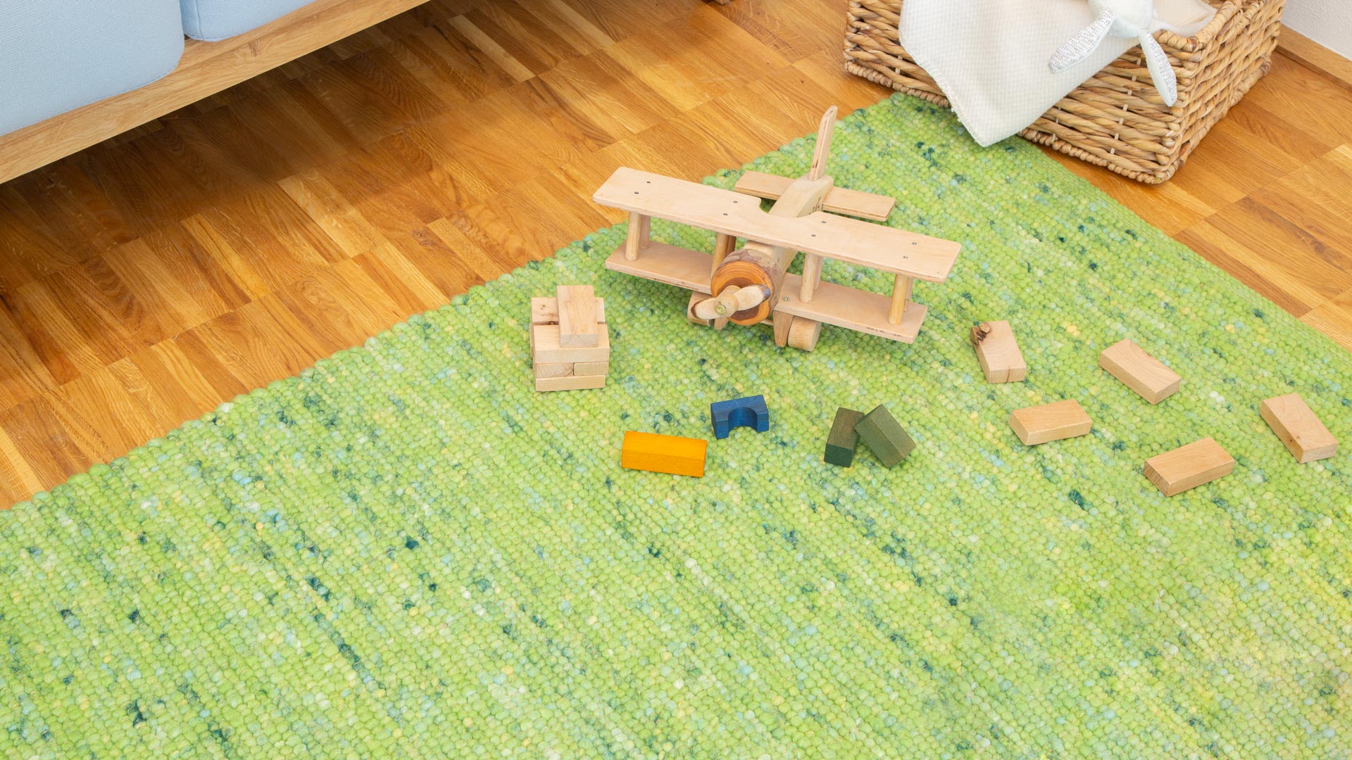 Das Garn für diesen Handwebteppich wird vor dem Weben gewalkt. Auf diese Weise schmiegt sich die Schafschurwolle der Umspinnung optimal an die "Seele", also den Kern aus Jutefasern an. Das Teppichgarn bekommt eine angenehm weiche, filzig glatte Struktur, in die Schmutz kaum eindringen kann. Auf diese Weise entsteht ein äußerst robuster Handwebteppich, an dem Sie auch in stark beanspruchten Bereichen lange Freude haben werden. Schurwollteppich "Toso" ist damit auch ideal als Spielteppich im Kinderzimmer. Mit seinen lebhaften Farben setzt er fröhliche Akzente und bringt Kinderaugen zum Strahlen. Die Unempfindlichkeit gegen Flecken und gegen solch schöne Dinge wie Knetmasse macht auch die Eltern glücklich.