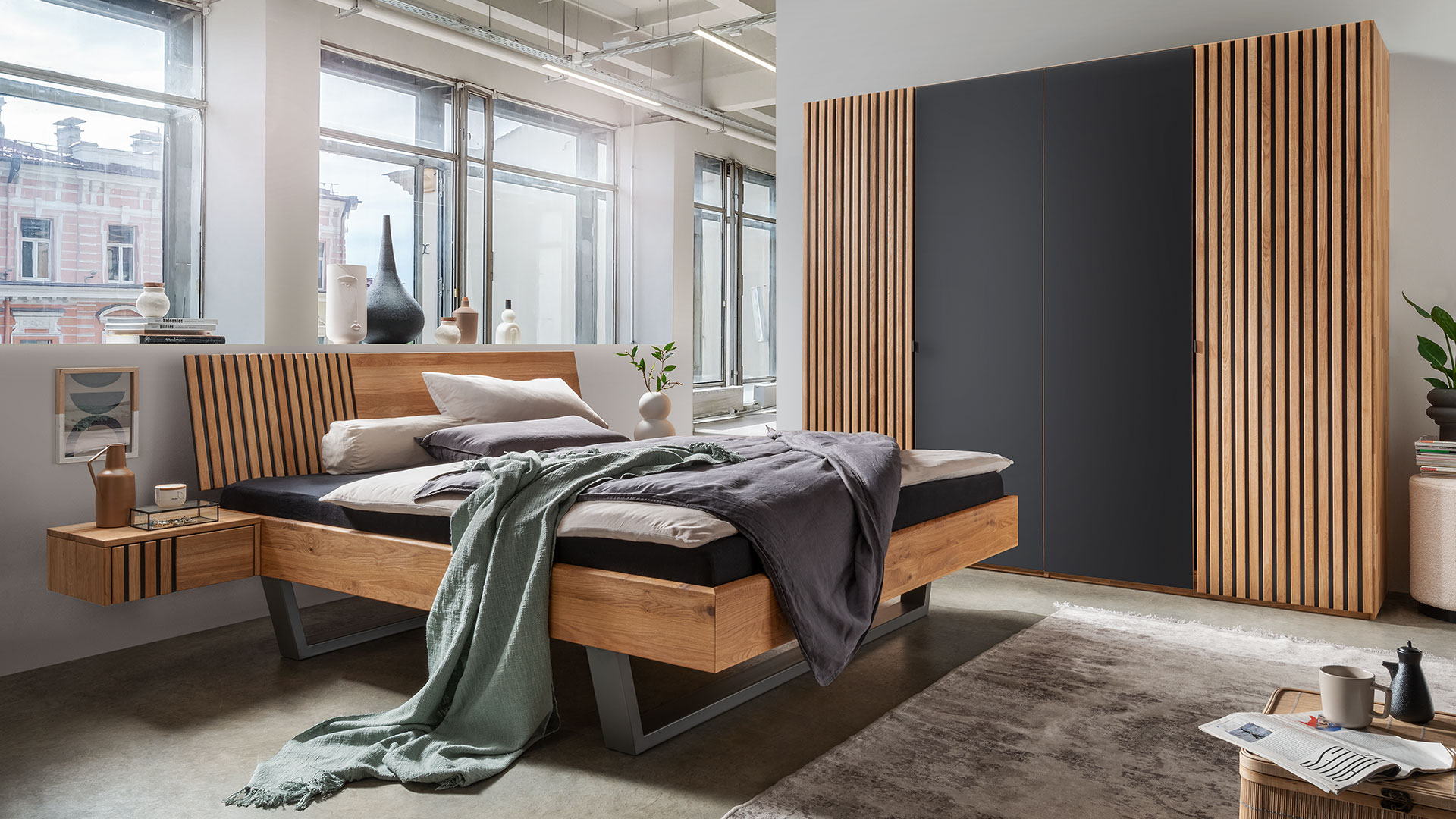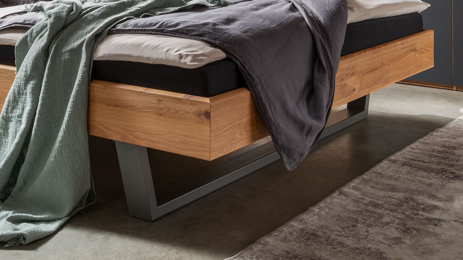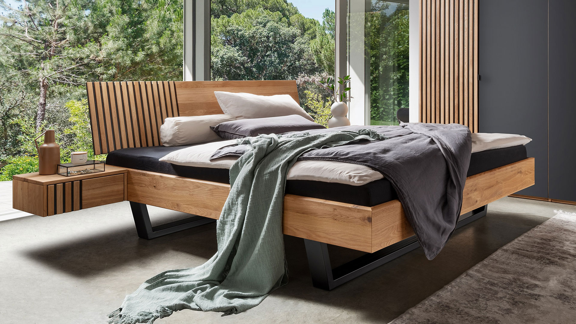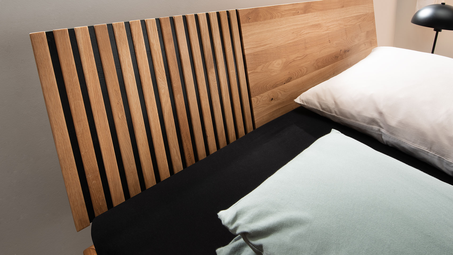 Das Massivholzbett aus edler Wildeiche begeistert mit seiner besonders stilvollen Akustikpaneel-Optik mit schlanken Lamellen auf dunklem Hintergrund. Passend dazu sind die markanten Holzkufen ebenfalls anthrazit-gebeizt. Sie erzeugen durch den Schwebeeffekt eine offene und luftige Atomsphäre.