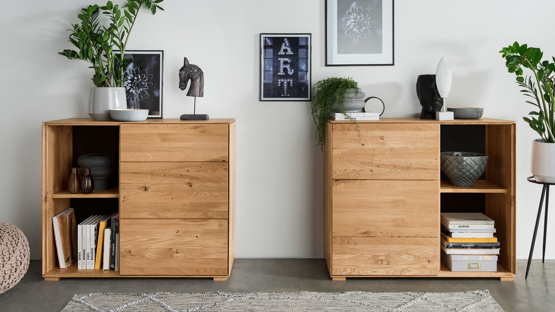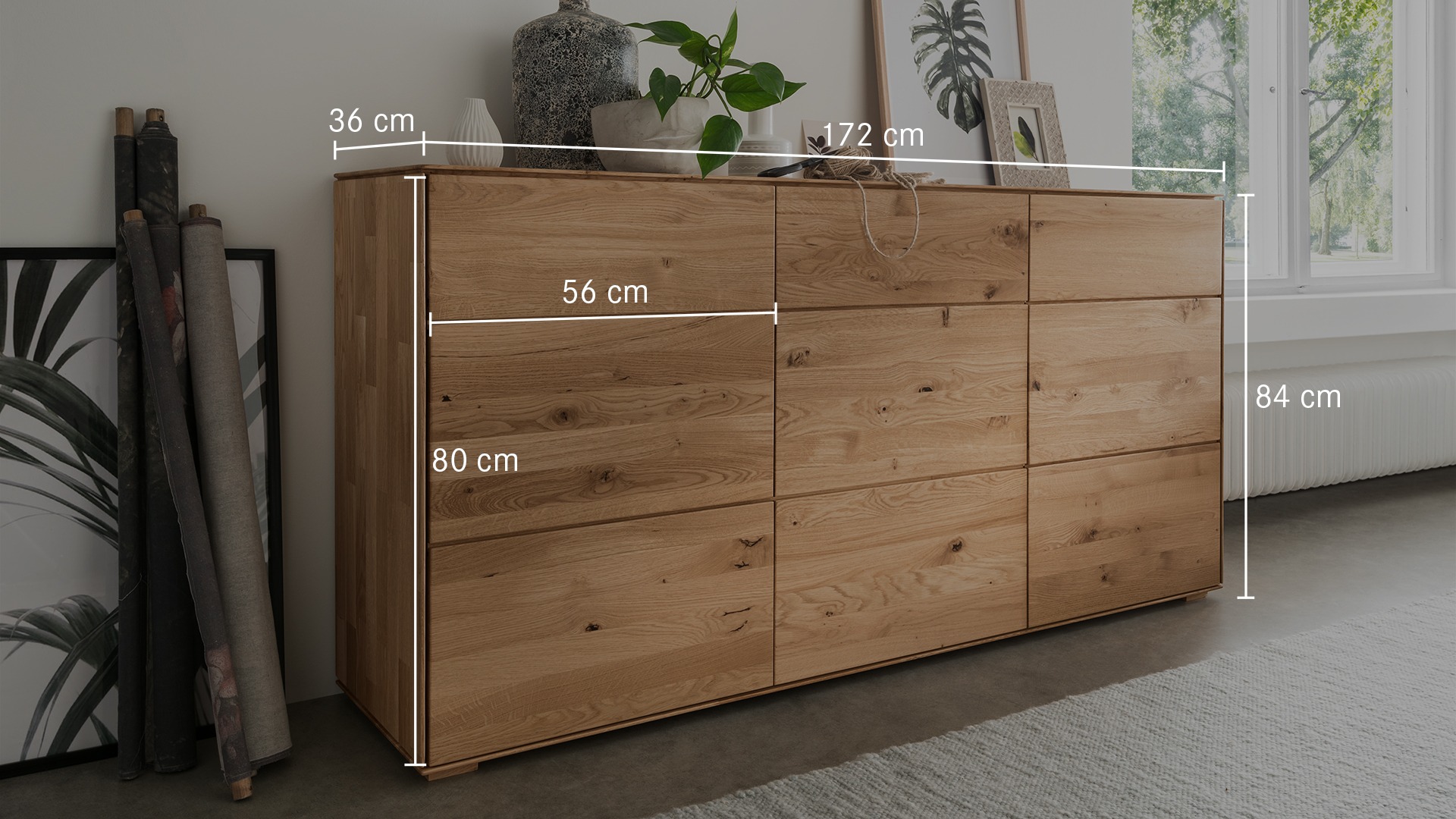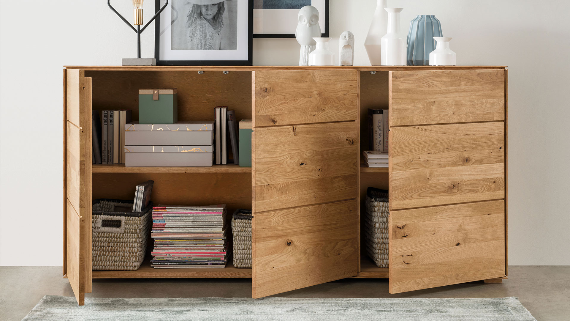 Verarbeitung und Holzcharakter stehen im Vordergrund. Ein vorne elegant ausgefräster Korpus und grifflose Fronten unterstreichen das Gesamtkonzept. Das große 3-türige Sideboard "Civenna" sorgt für viel Stauraum, ohne plump zu wirken. Die Türen dieses eleganten Möbelstücks sind mit Schattenfugen ausgestattet, die der Frontfläche Struktur geben.