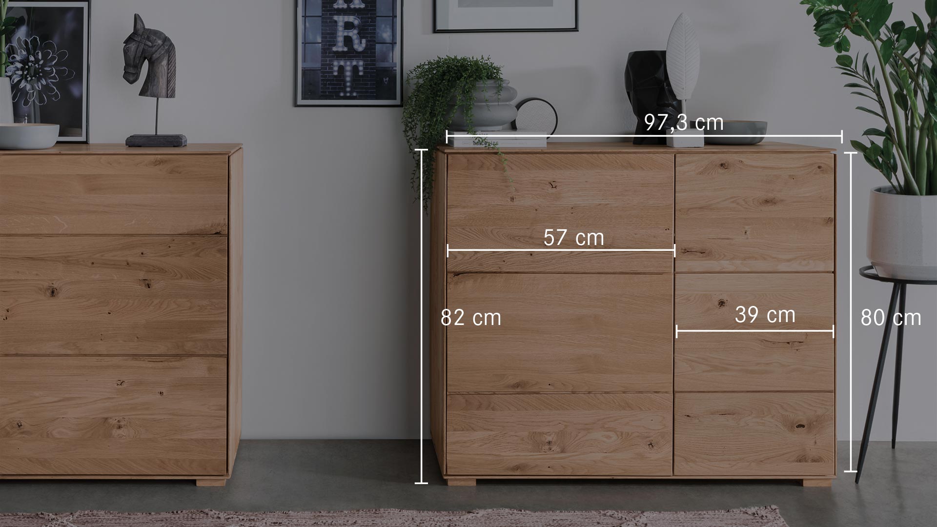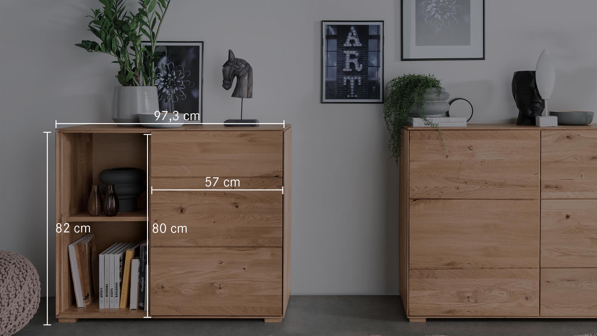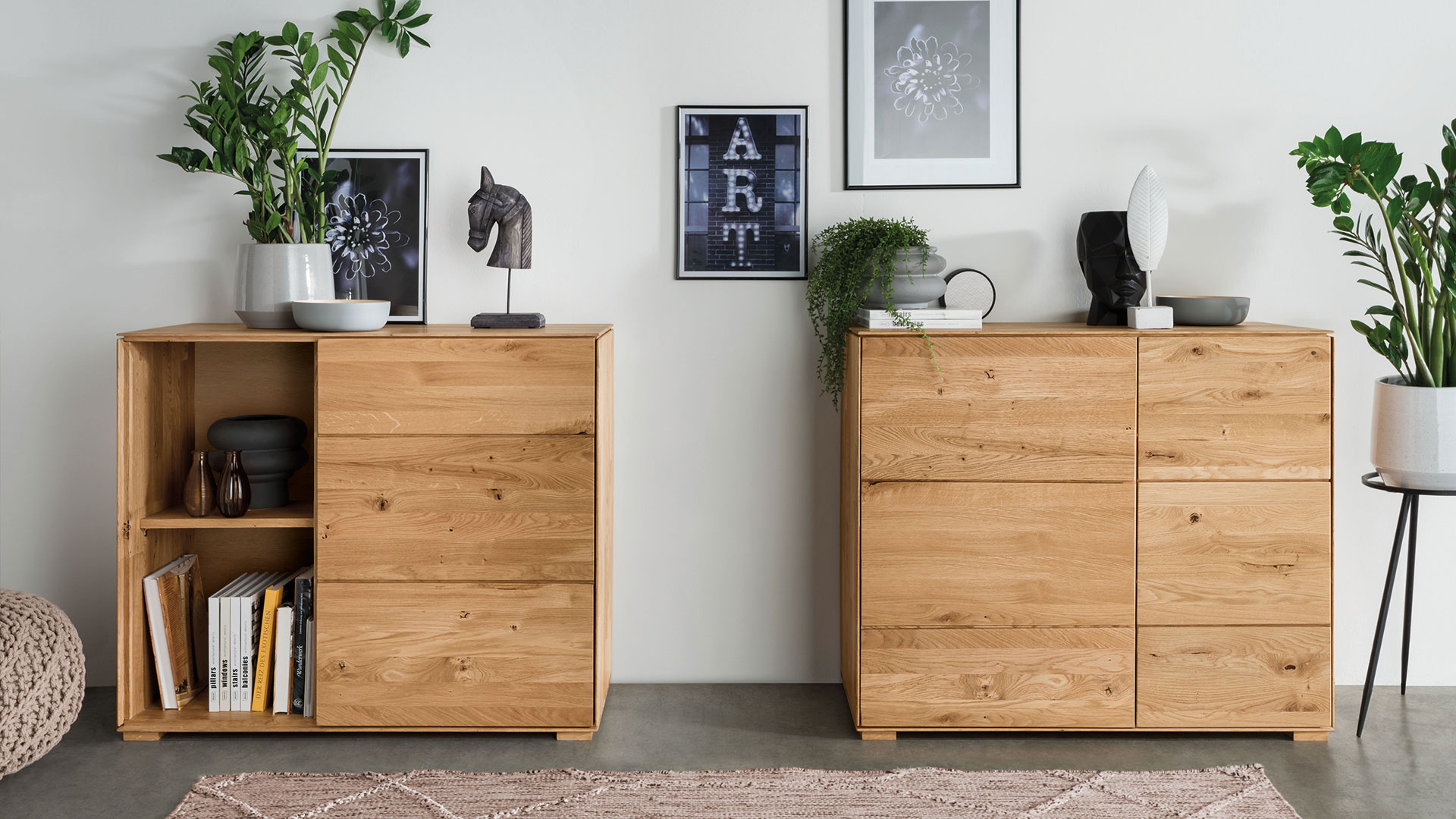 Verarbeitung und Holzcharakter stehen im Vordergrund. Ein vorne elegant ausgefräster Korpus und grifflose Fronten unterstreichen das Gesamtkonzept. Das große 3-türige Sideboard "Civenna" sorgt für viel Stauraum, ohne plump zu wirken. Die Türen dieses eleganten Möbelstücks sind mit Schattenfugen ausgestattet, die der Frontfläche Struktur geben.