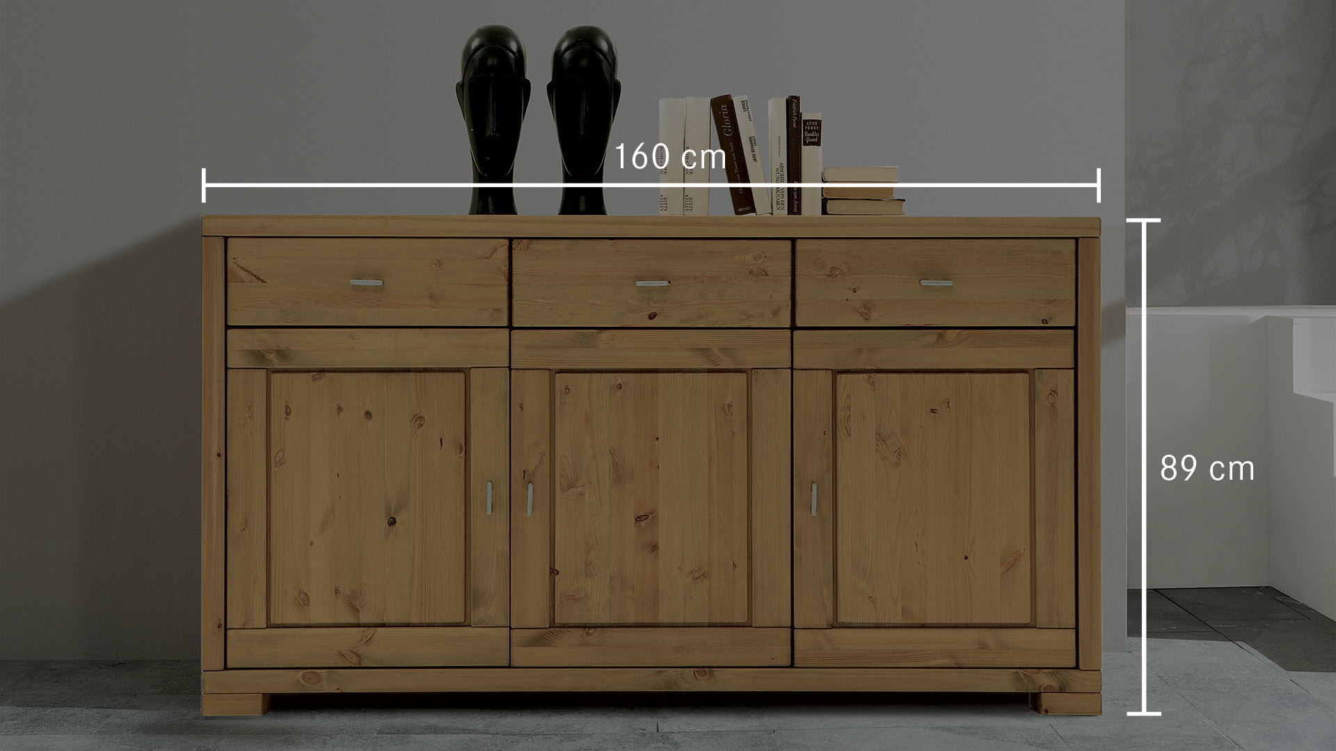 Es erwartet Sie nämlich ein wahres Stauraum-Wunder hinter 3 Holztüren und 3 geräumigen Schubladen. Alle Holzböden der Sideboards sind mittels Reihenlochbohrung höhenverstellbar, so dass die Inneneinteilung individuell angepasst werden kann. Die Holztüren der exklusiven Sideboards bezaubern mit reizvollen Kassetten. Die Herstellung erfolgt in liebevoller, traditioneller Handwerksarbeit.