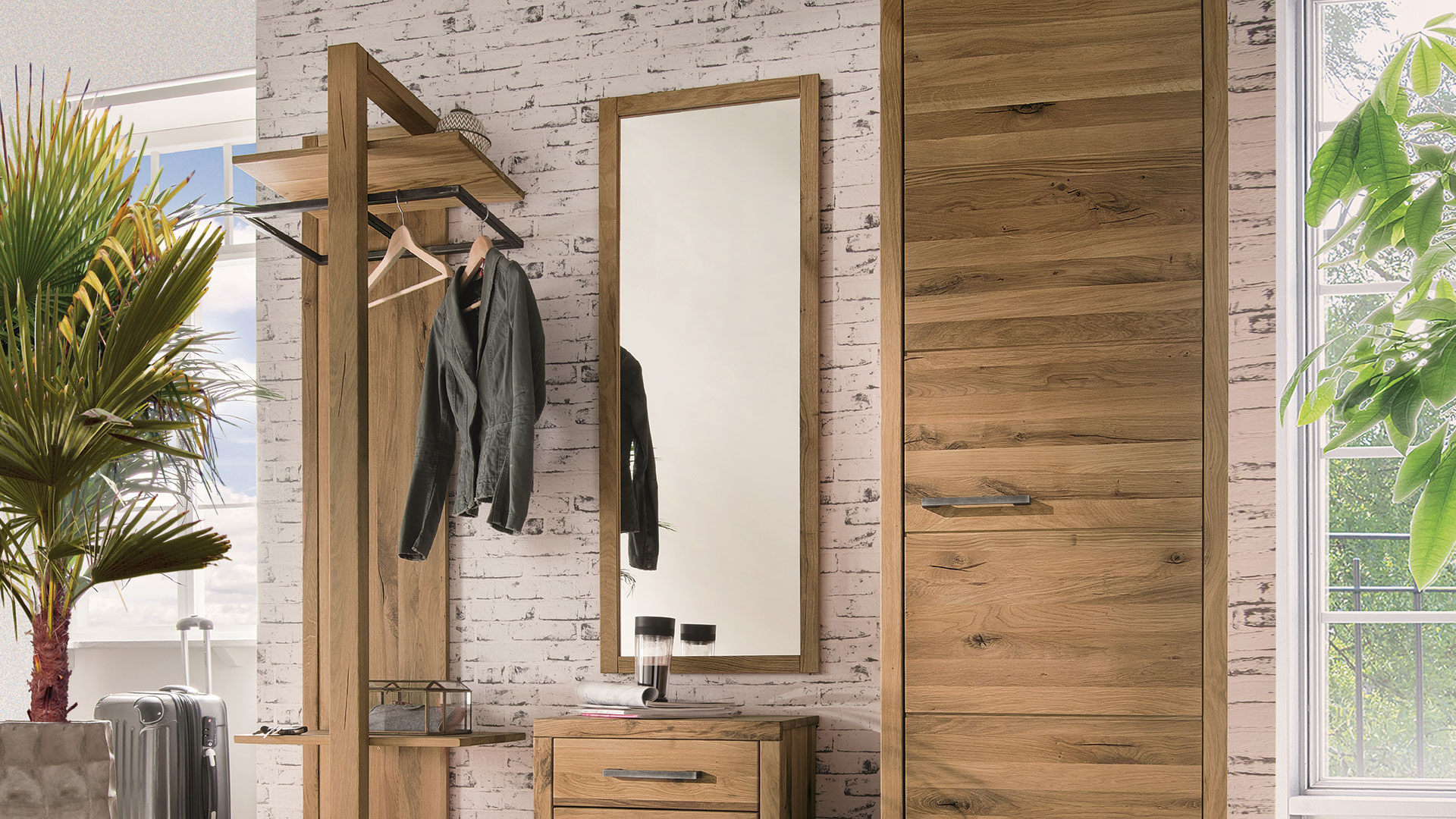 Spiegel "Locana" begeistert mit seinem breiten Rahmen aus massiver Kernbuche oder Wildeiche. Die markante Maserung mit gekonnt herausgearbeiteten Wuchsrissen bestimmt den einzigartigen Charakter dieses Spiegels.