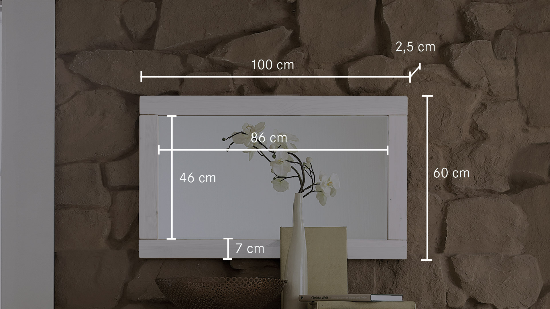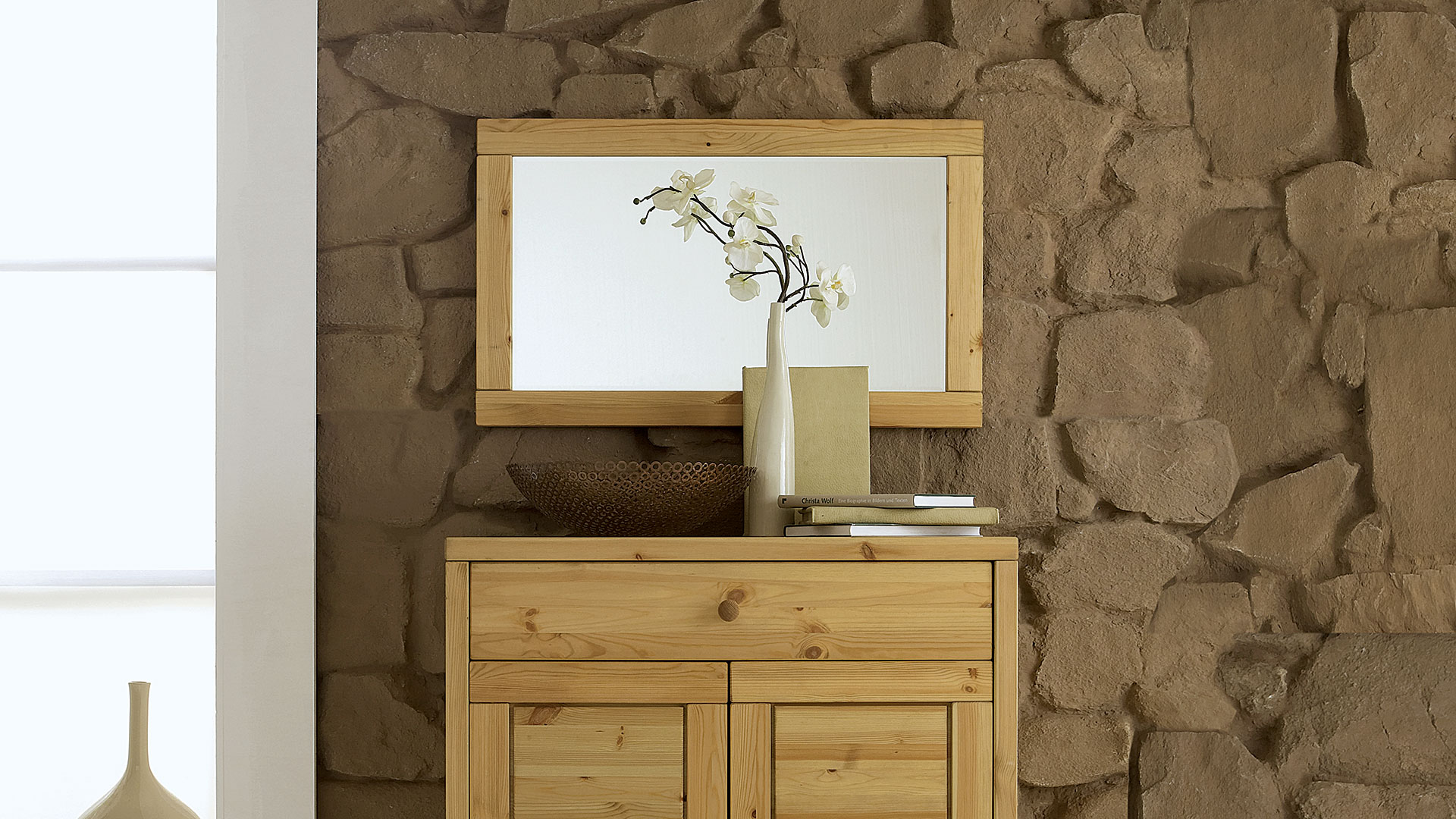 ... Denn er täuscht dem Auge die doppelte Raumtiefe vor und reflektiert vorhandenes Licht. Mit seinem schönen, breiten Rahmen aus wohnlichem Kiefernholz setzt er zudem edle Akzente.