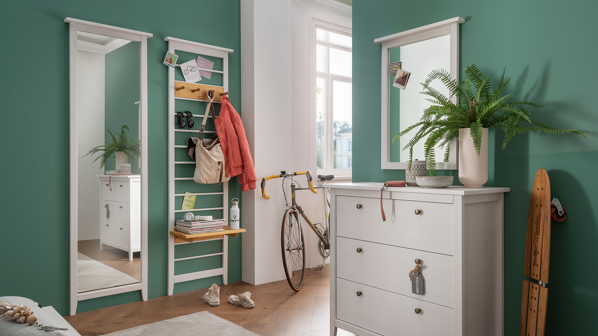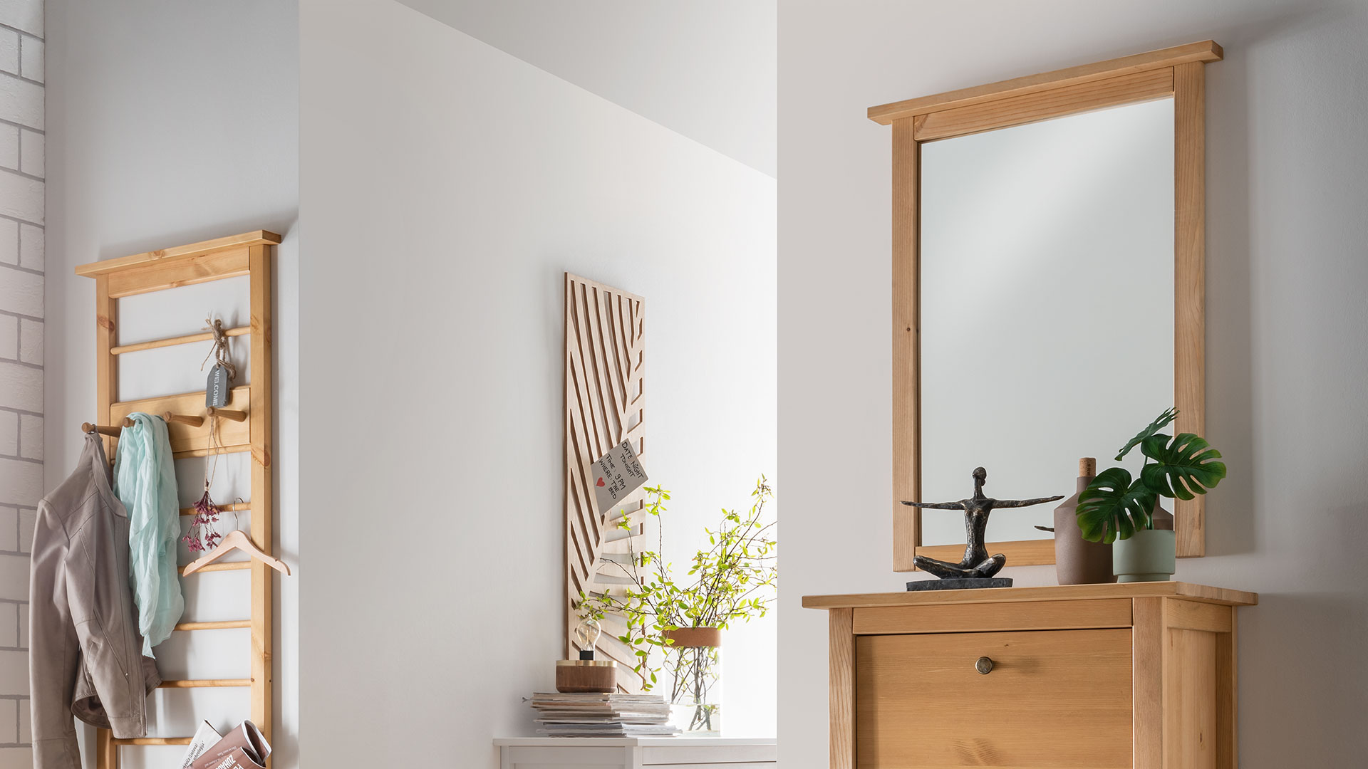 Ob im Schlafzimmer, Eingangsbereich oder im begehbaren Kleiderschrank - der Spiegel "Tusa" macht überall eine gute Figur. Der oben leicht überstehende Rahmen gibt dem Spiegel eine moderne Form. Sie entscheiden was am besten zu Ihrer Wohnung passt: der Rahmen ist gelaugt/geölt oder in weiß-gewachst erhältlich. In zwei verschiedenen Größen setzt Sie der Spiegel sicher immer gut in Szene.