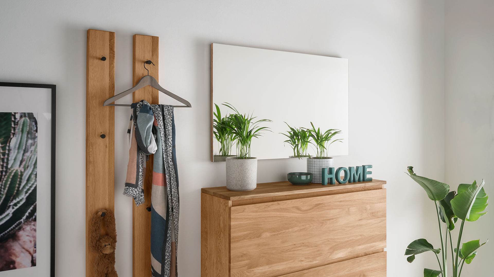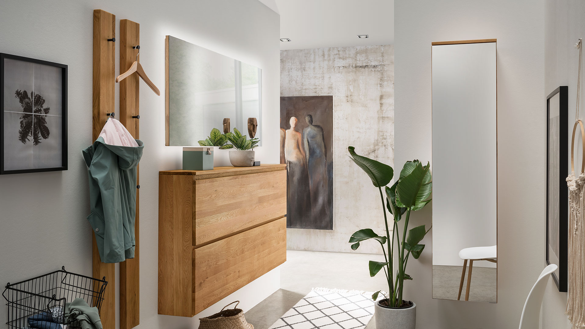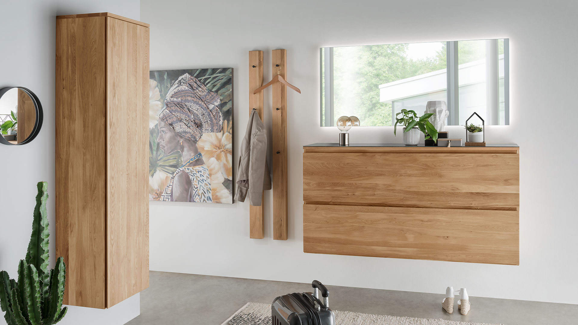 Das Dielenmöbel-Programm "Volitare" bietet Ihnen und Ihren Gästen einen Empfang der Extraklasse. Diese moderne Serie begeistert durch Ihre optische Leichtigkeit, da alle Möbel hängend angebracht werden. Das massive Wildeichenholz kommt durch die geradlinige Gestaltung attraktiv zur Geltung. Freuen Sie sich jeden Tag über Ihr ganz persönliches Empfangskomitee.