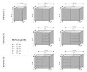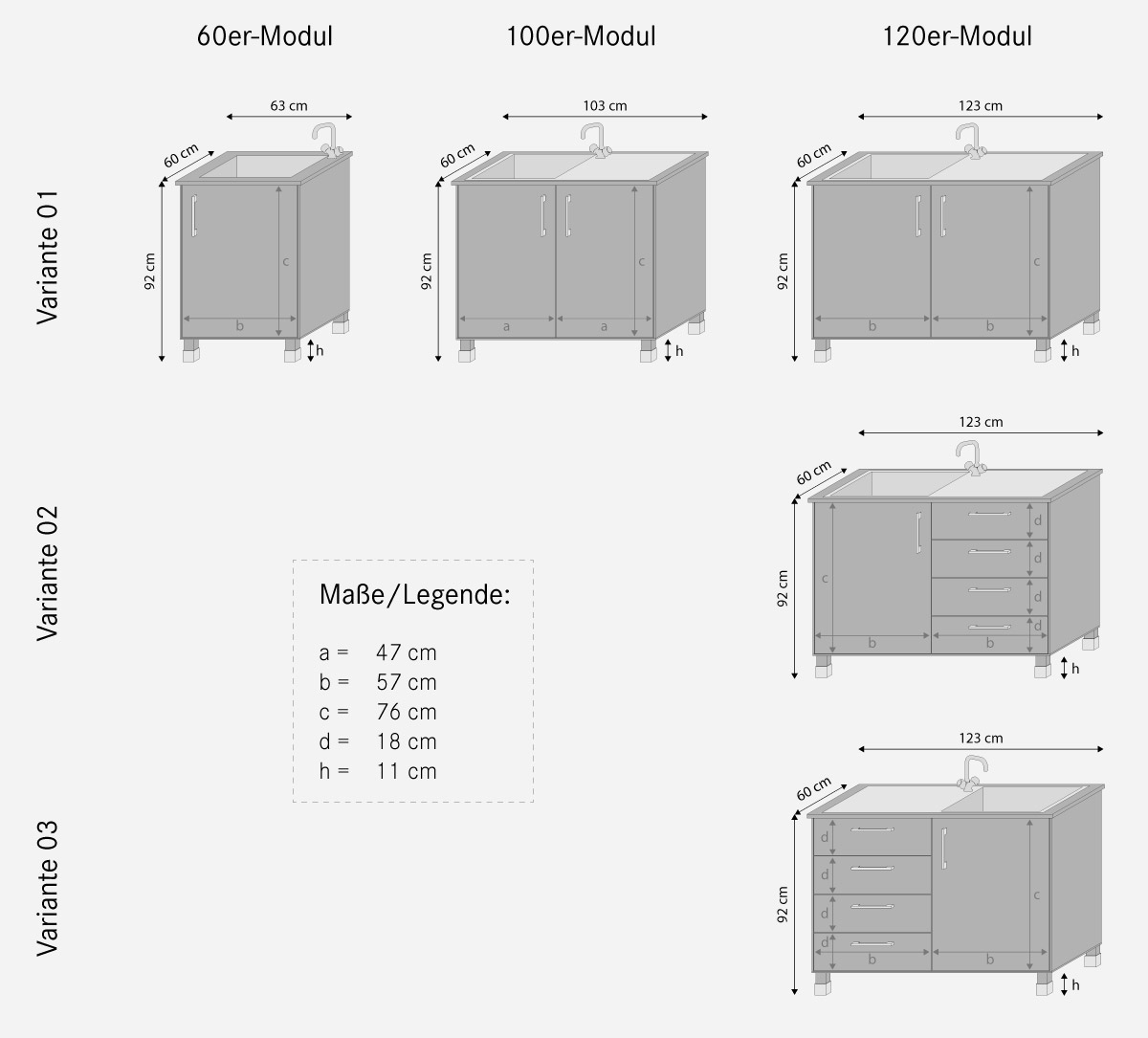 Wählen Sie zwischen 3 praktischen Varianten. Hinter der Türe lassen sich Spülutensilien, Putzmittel und Abfallbehälter geschmackvoll verbergen. Die Schubladen der Varianten 02 und 03 bieten Platz für Putz- oder Abtrockentücher, Küchenutensilien oder Krimskrams. Dank der durchgehenden Arbeitsplatte ohne Spülenausschnitt können Sie Ihre individuelle Wunschspüle integrieren. "Culinara" ist eine durchdachte Küchenlösung im modernen Design.