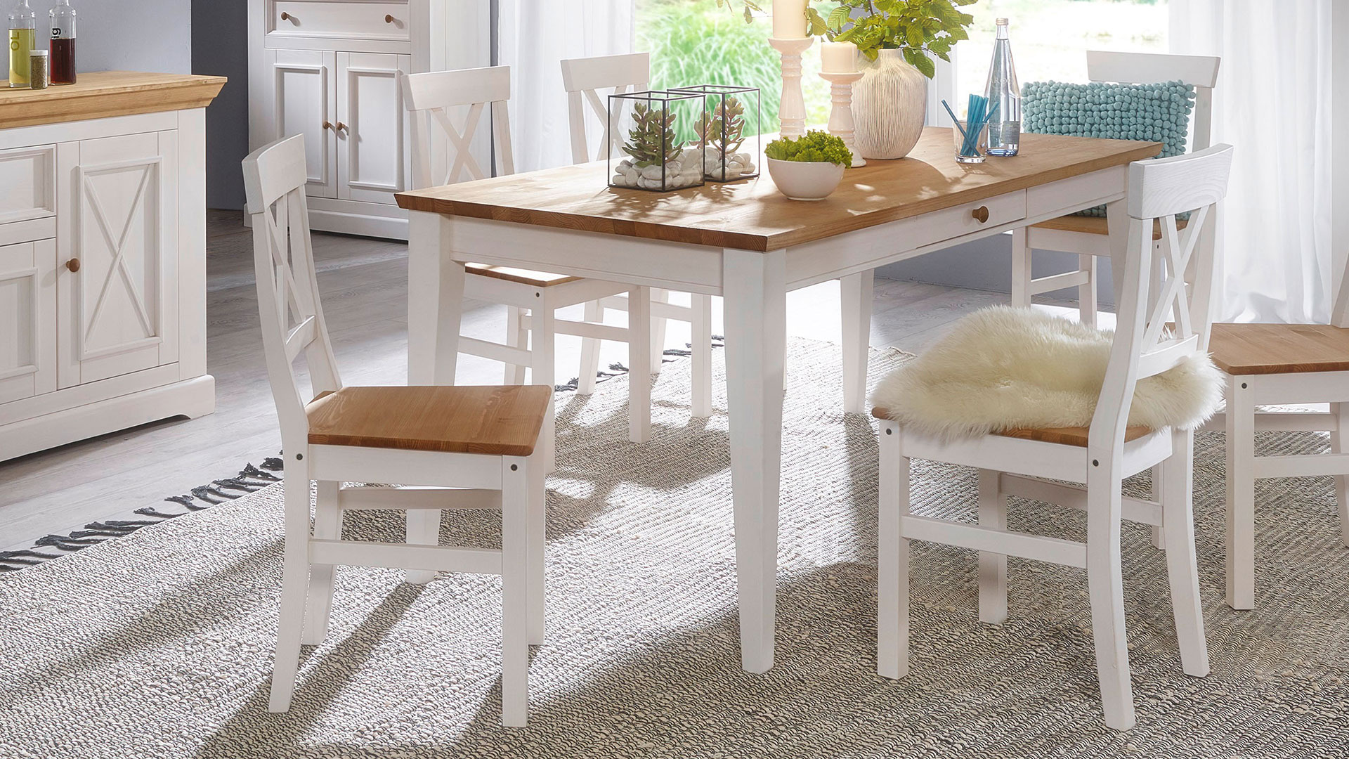 Stuhl "Molina" ist liebevoll und detailreich im Landhausstil gestaltet. Das massive Kiefernholz ist sorgfältig gewachst - wahlweise in frischem Weiß oder modern kühlem Anthrazit. Einen schönen Kontrast dazu bildet die eichefarbig lasierte Sitzfläche.