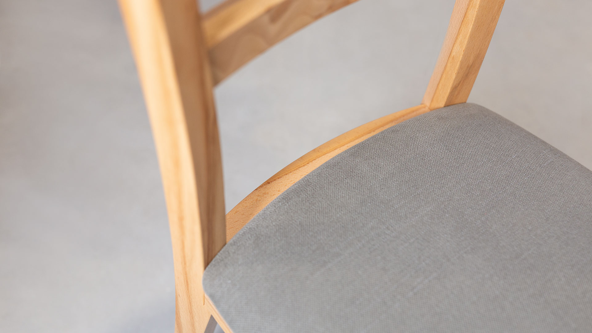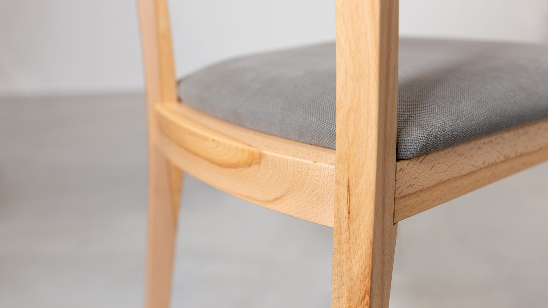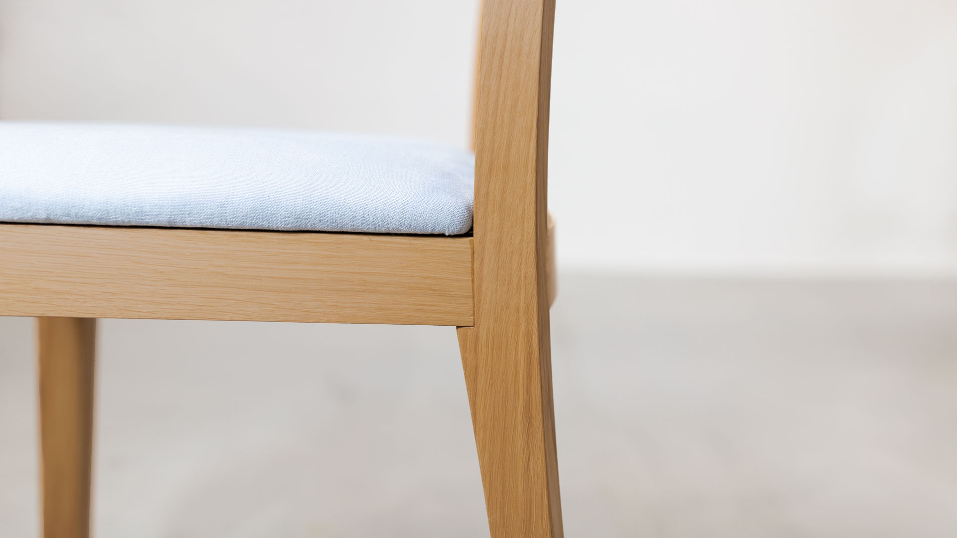 Er wirkt klassisch und gleichzeitig modern, hat ein klares und elegantes Design. Wir haben das Modell in herrlich gemusterter Kernbuche mit dem stabilen Baumwoll-Leinen-Sitzpolster in grau, diese Kombi gefällt uns und anderen Familienmitgliedern ausgezeichnet. Auch ohne Rückenpolsterung sitzen wir beide (trotz unterschiedlicher Anatomie) darauf ganz prima. Die Verarbeitung und das Material sind hervorragend. Einzig die Sitzpolsterung (der Schaum, der Überzugsstoff ist perfekt) könnte etwas stabiler sein, dafür würden wir auch etwas mehr ausgeben. Aber die 30€ extra (pro Stuhl) für die Sitzpolsterung rentieren sich aus unserer Sicht in jedem Fall, da der Stuhl dadurch viel wohnlicher aussieht und auch ein zusätzliches Stuhlkissen (z. B. aus ungefärbtem Bio-Wollfilz) darauf besser haftend liegt und nicht bei jedem Aufstehen (wie bei glatter Holzsitzfläche) wegrutscht.