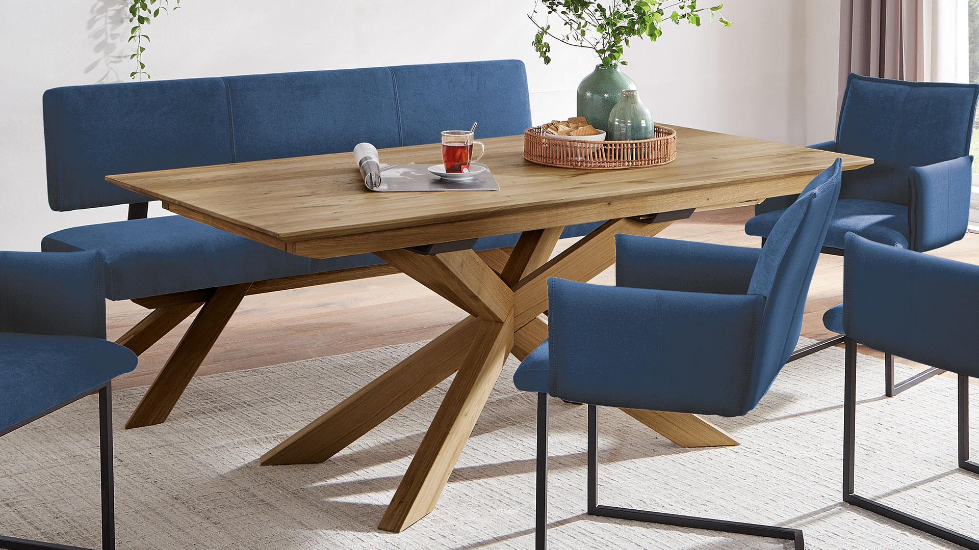 ...für lieben Besuch. Das Holzgestell in angesagter Spider-Form ist nicht nur ein ganz besonderer Hingucker, sondern sorgt nebenbei auch für enorme Beinfreiheit. Darf es für Sie etwas spektakulärer sein? Dann erwartet Sie das trendig, schwarz pulverbeschichtete Gestell oder die extravagante Ausführung aus gebürstetem Edelstahl. Durch den optionalen hochwertigen Zargenauszug schaffen Sie im Handumdrehen Platz für weitere Gäste. Wählen Sie je nach Räumlichkeit und Ihren Bedürfnissen Ihre Wunschgröße mit ein- oder beidseitigem Zargenauszug.