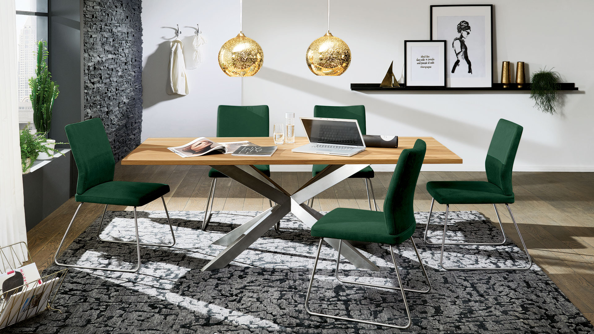 Sie möchten einen Esstisch aus natürlichem Massivholz, der aber nicht klassisch-rustikal wirkt? Dann ist "Aurana" der perfekte Tisch für Sie! Das Gestell in Spider-Form in Kombination mit der Tischplatte aus edlem Kernbuchen-, Wildeichen- oder Nussbaumholz ist die moderne Antwort auf den klassischen Massivholztisch. Es darf für Ihren Geschmack noch etwas spektakulärer werden? Dann ist die Ausführung mit markantem Metallgestell perfekt für Sie. Auch hier ganz nach Ihren Wünschen pulverbeschichtet in mattschwarz oder elegant aus gebürstetem Edelstahl.