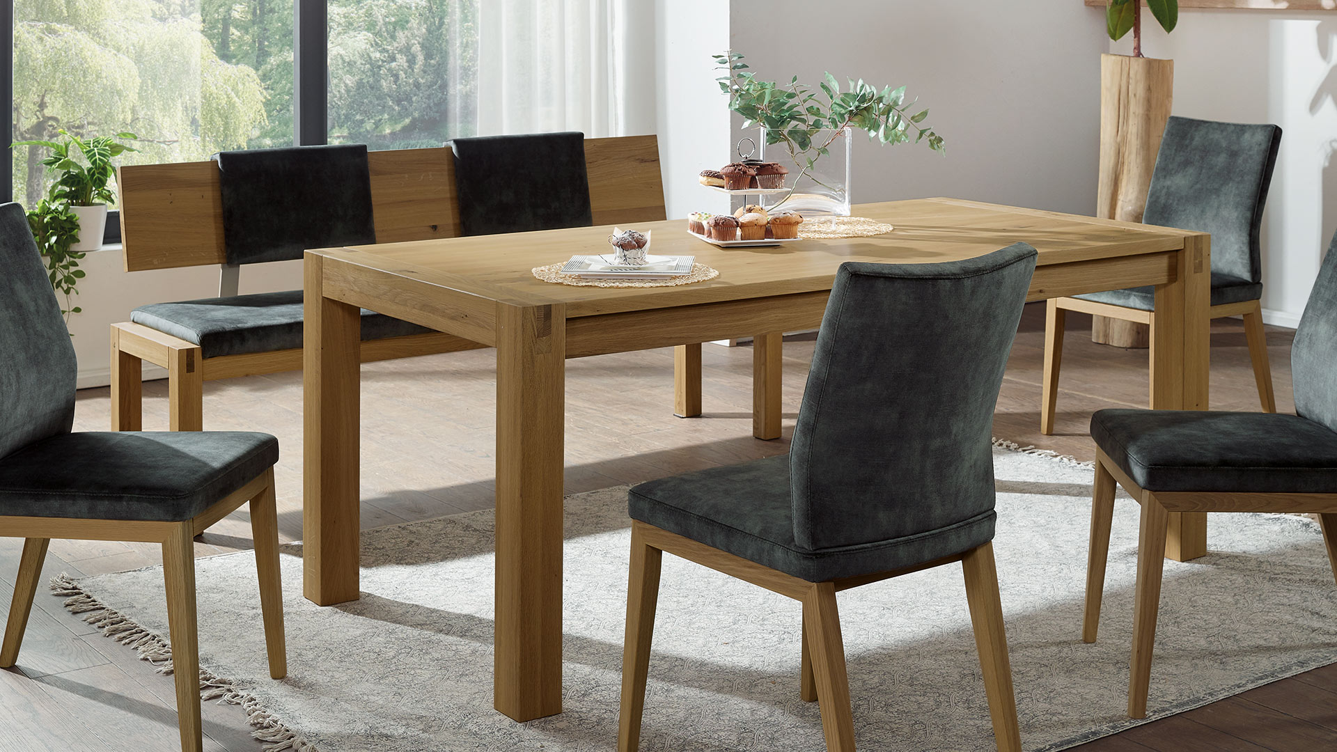 Esstisch "Imago" schafft Atmosphäre. Das edle, von Schreinerhand ausgesuchte Massivholz strahlt Wärme und Behaglichkeit aus und macht den Tisch zum beliebten Treffpunkt für Freunde und Familie.