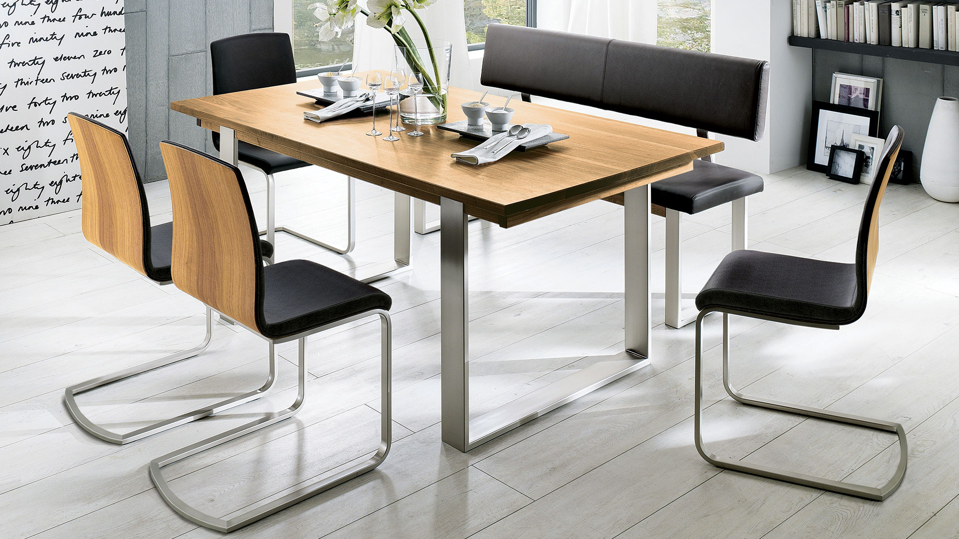 Die Tischplatte aus massivem, geöltem Kernbuchen, Nussbaum- oder Eichenholz ruht auf einem stabilen Edelstahlgestell. Der gekonnte Materialmix aus Massivholz und Edelstahl unterstreicht das edle Ambiente Ihrer Wohnung.