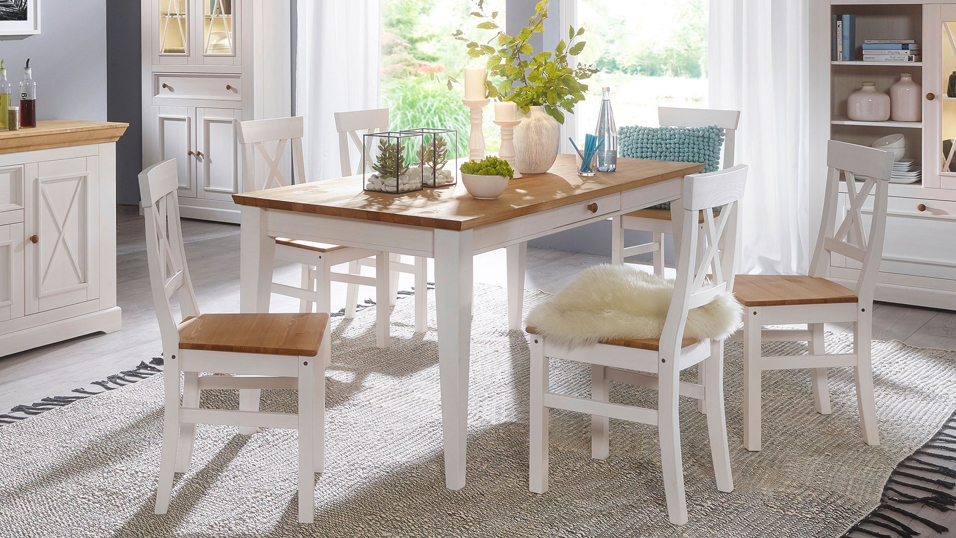 Esstisch "Molina" ist detailreich im Landhausstil gehalten und wird aus massivem Kiefernholz gefertigt. Er steht auf elegant abgeschrägten Tischbeinen und hat eine hohe, deutlich zurückgesetzte Zarge. Dort ist eine praktische Schublade eingearbeitet - ideal beispielsweise für Besteck. Die schöne Tischplatte in beeindruckender Stärke ist sorgfältig schräg profiliert.