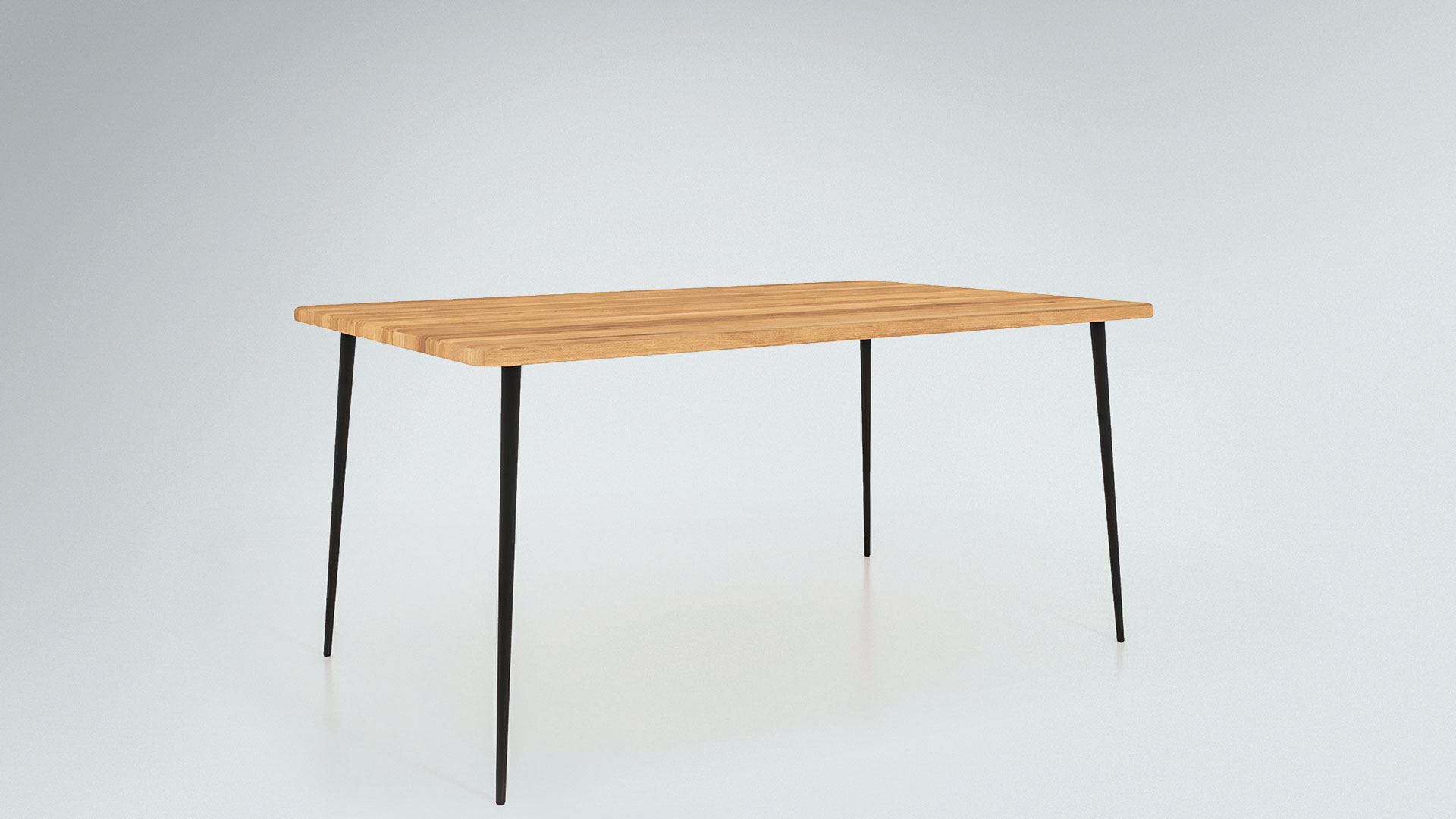 Die lamellenverleimte Tischplatte setzt die Maserung des Holzes - wahlweise Kernbuche oder Wildeiche - gekonnt in Szene und lädt zu stilvollen Stunden mit Familie und Freunden ein. Die leicht schräg zulaufenden Tischbeine aus Metall geben "Ondas" stabilen Halt.