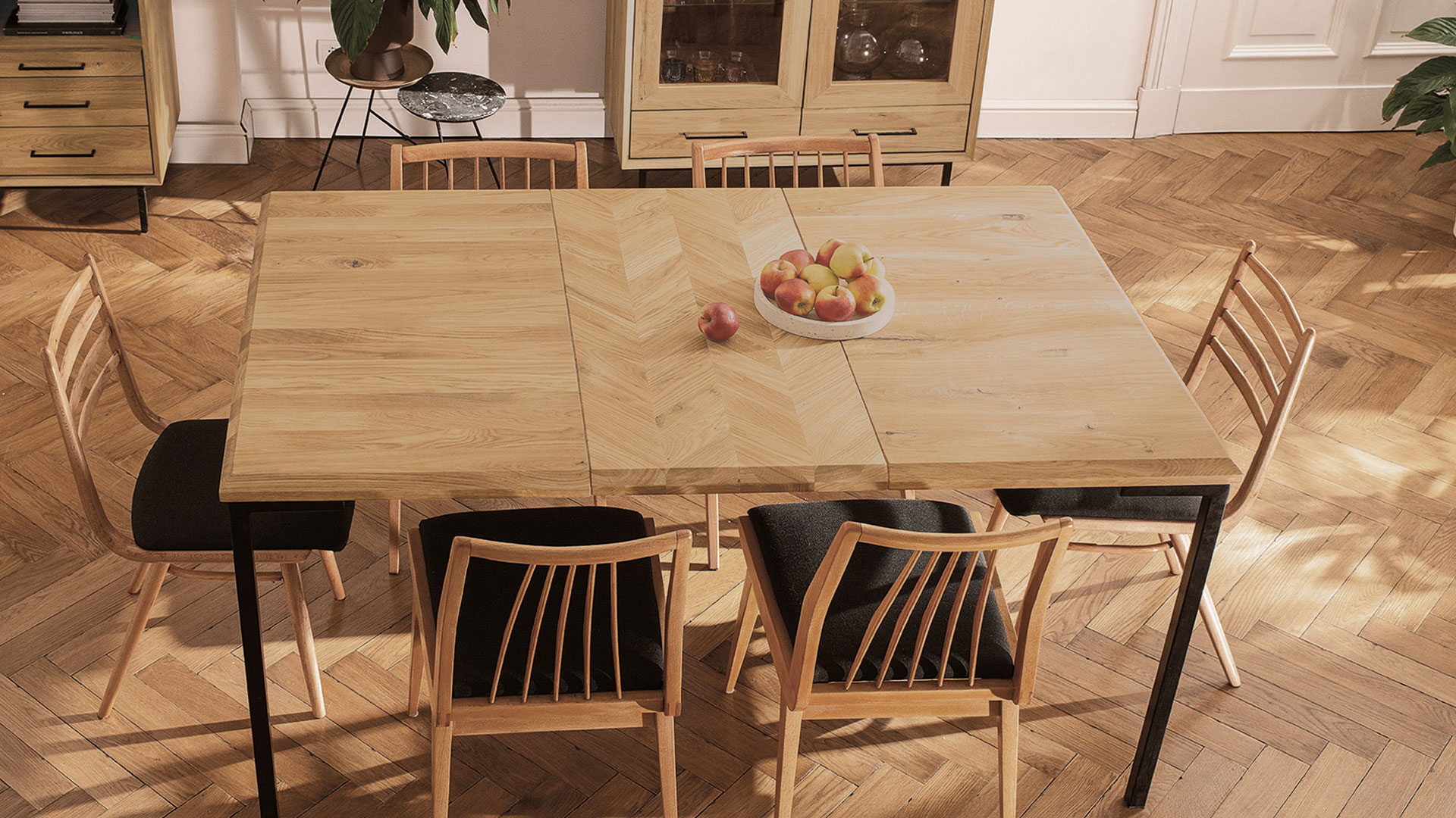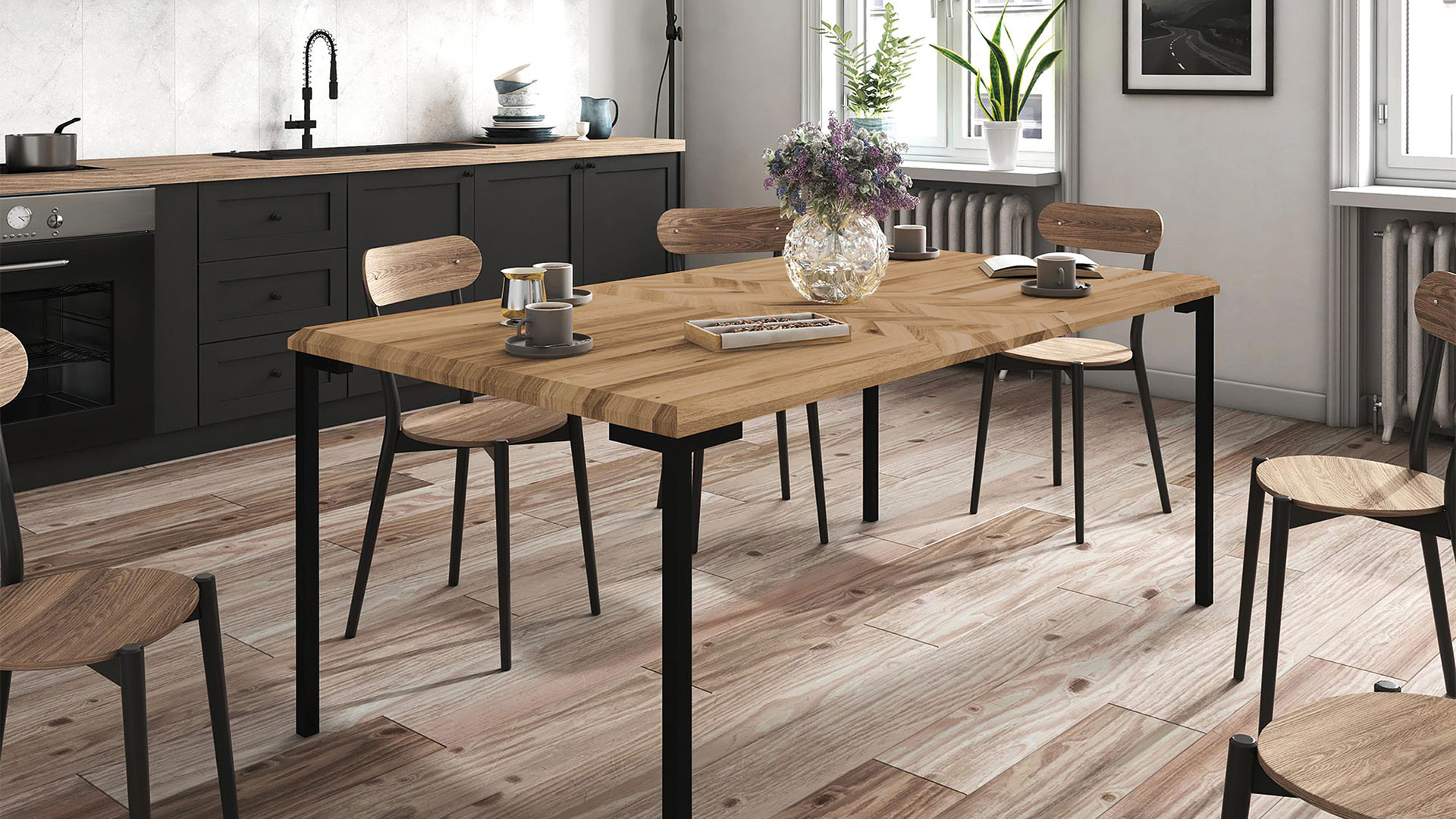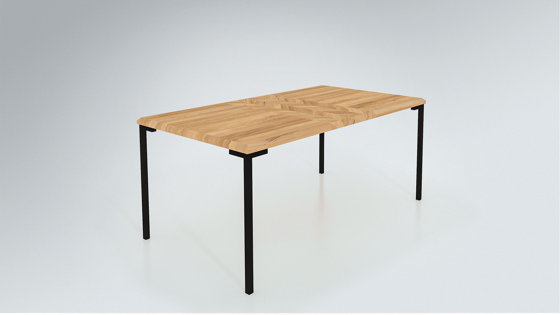 Ganz dem Industrial Design folgend steht der Tisch stabil auf schlanken, schwarzen Winkel-Fußelementen aus Metall. In der Mitte des modernen Schmuckstücks verläuft ein breites Zierband im Fischgrät-Muster. Die Tischplatte ist zudem elegant abgeschrägt. Dieser attraktive Esstisch ist in 5 verschiedenen Größen erhältlich. Bei der Tischplatte haben Sie die die Wahl zwischen eleganter Kernbuche und markanter Wildeiche. Was passt besser zu Ihnen?