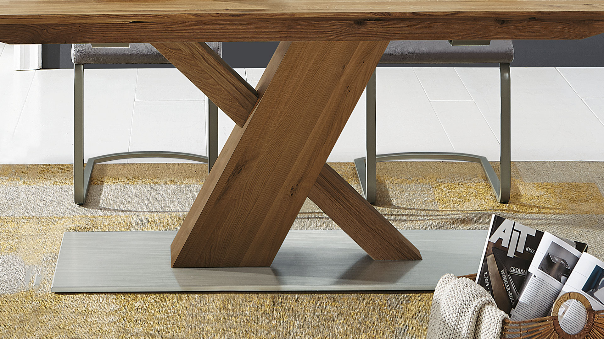 Dieser attraktive Säulentisch zieht durch seine x-förmigen Säulen in unterschiedlichen Holzstärken automatisch bewundernde Blicke auf sich. Das edle Massivholz und die Bodenplatte aus pulverbeschichtetem Metall in Silbergrau oder Mattschwarz bilden einen pfiffigen Materialmix. Diesen modernen Tisch erhalten Sie in lebhafter Kernbuche, eleganter Wildeiche oder ganz edel in Nussbaum.