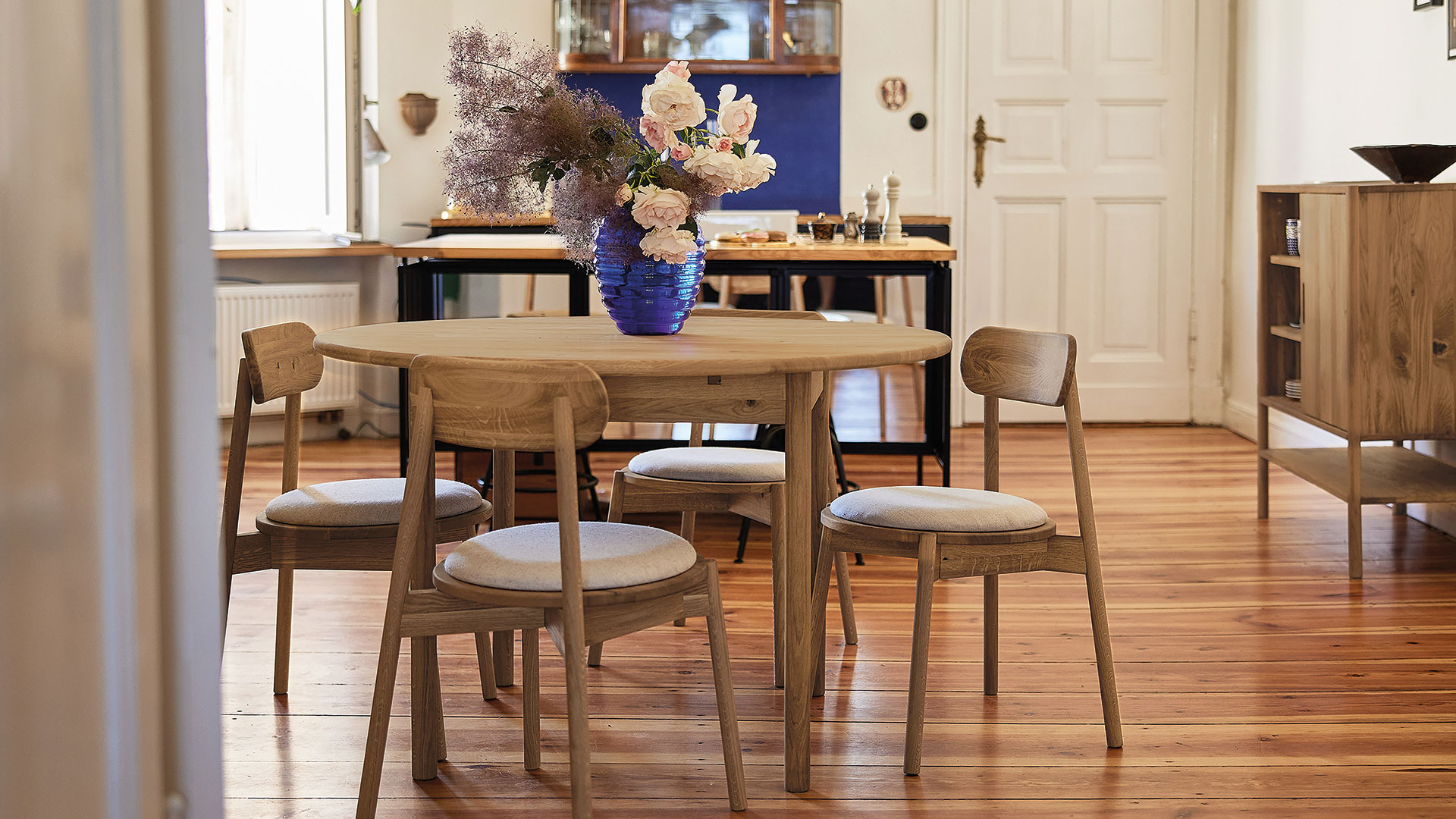 Der gemütliche Tisch in klassischem Design fügt sich harmonisch in jeden Wohnstil ein. Die schöne, durchgehend lamellenverleimte Tischplatte mit abgerundeter Kante liegt auf einer rechteckigen, hohen Zarge auf. Dort sind elegante Säulenfüße eingearbeitet, die dem Tisch stabilen Halt geben. Wenn Sie sich für einen ausziehbaren Tisch entscheiden, verbirgt sich bei den runden Tischen und den ovalen Tischen bis 160 cm Länge immer eine Einlegeplatte unter der Tischplatte. Bei den längeren ovalen Tischen sind es 2 Einlegeplatten. So haben Sie immer genug Platz für die Familie und Ihre Gäste und können auch große Tafelrunden entspannt genießen.
