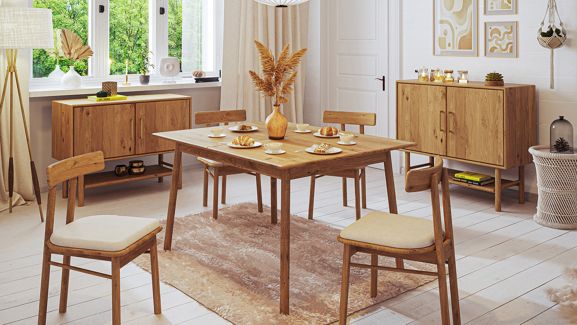 Der solide Massivholztisch begleitet Sie über viele Jahre. Wählen Sie zwischen Kernbuche und Wildeiche im hellen Naturton oder in der edel-dunklen Variante Wildeiche mokka. "Serea" gibt es ohne Auszug oder mit praktischer Auszugsfunktion, die Platz schafft, wenn Gäste kommen. Mit einer Breite von 1 Meter und Längen von 120 bis 200 cm passt er sich perfekt an Ihr Zuhause an. Ein Tisch, der Design, Alltagstauglichkeit und Geselligkeit harmonisch verbindet.