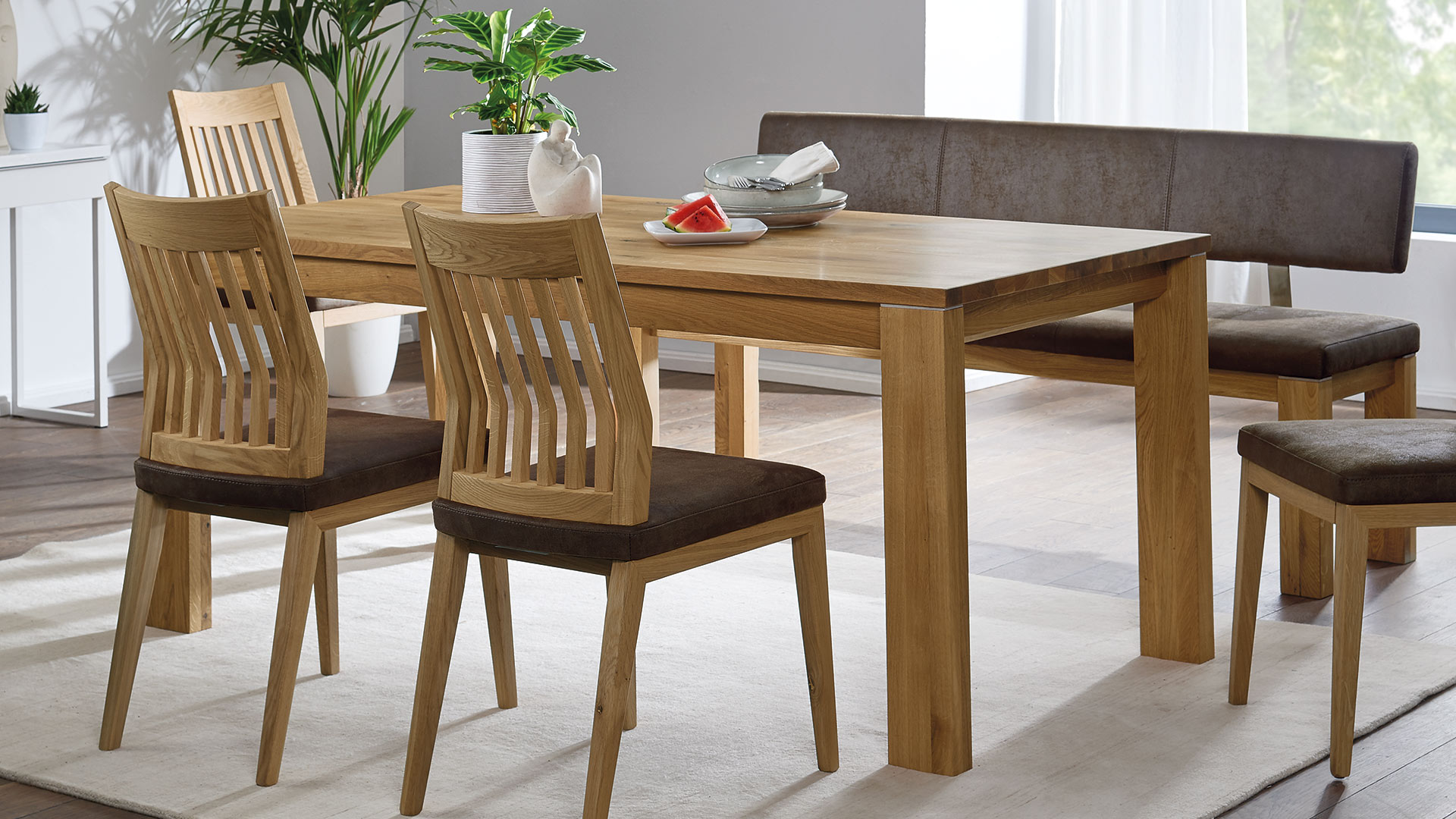 Dieser schöne Esstisch mit klarer Formensprache stellt das wertvolle Massivholz in den Vordergrund. Die schöne Tischplatte mit durchgehenden Lamellen und gerader Kante ruht auf rechteckigen Tischbeinen mit beeindruckender Tiefe. Kühle Edelstahl-Distanzplatten setzen elegante Akzente. Die Tischbeine sind bündig mit der Tischkante angebracht. So lässt sich auch bei Tischbreite 80 cm an den Schmalseiten des Tisches bequem ein Stuhl platzieren.