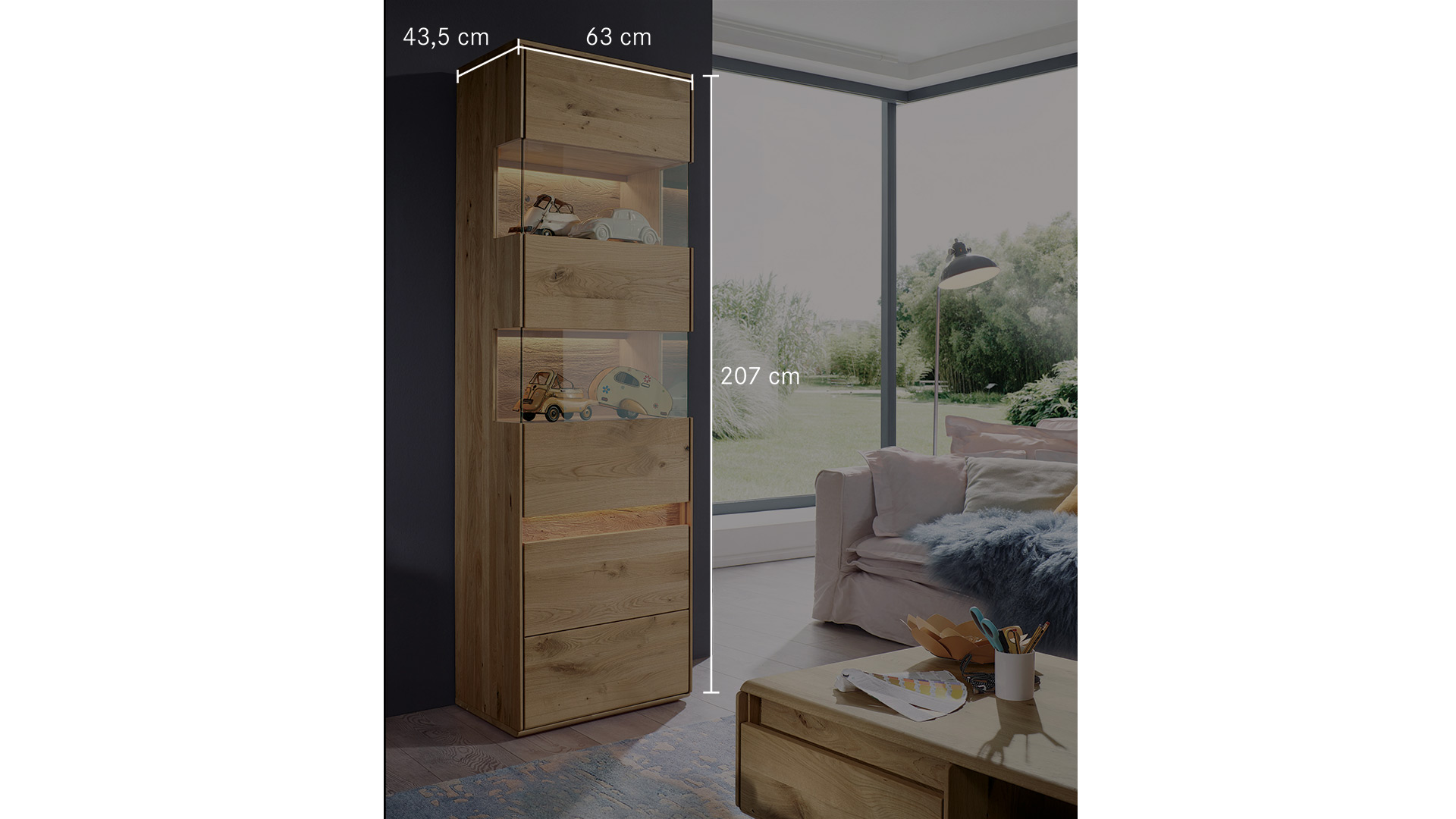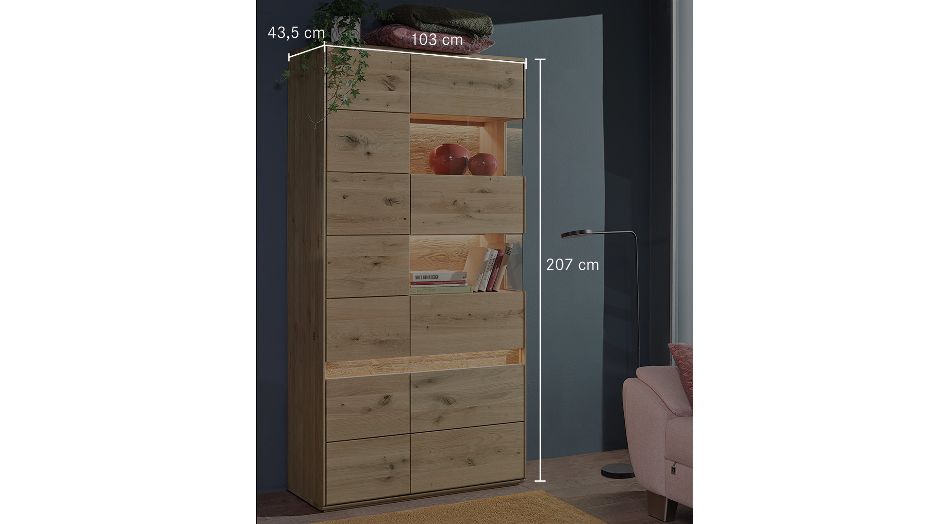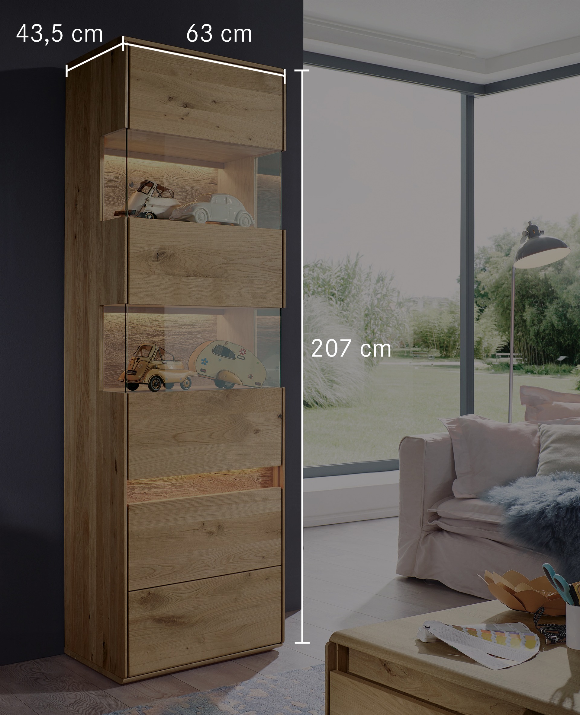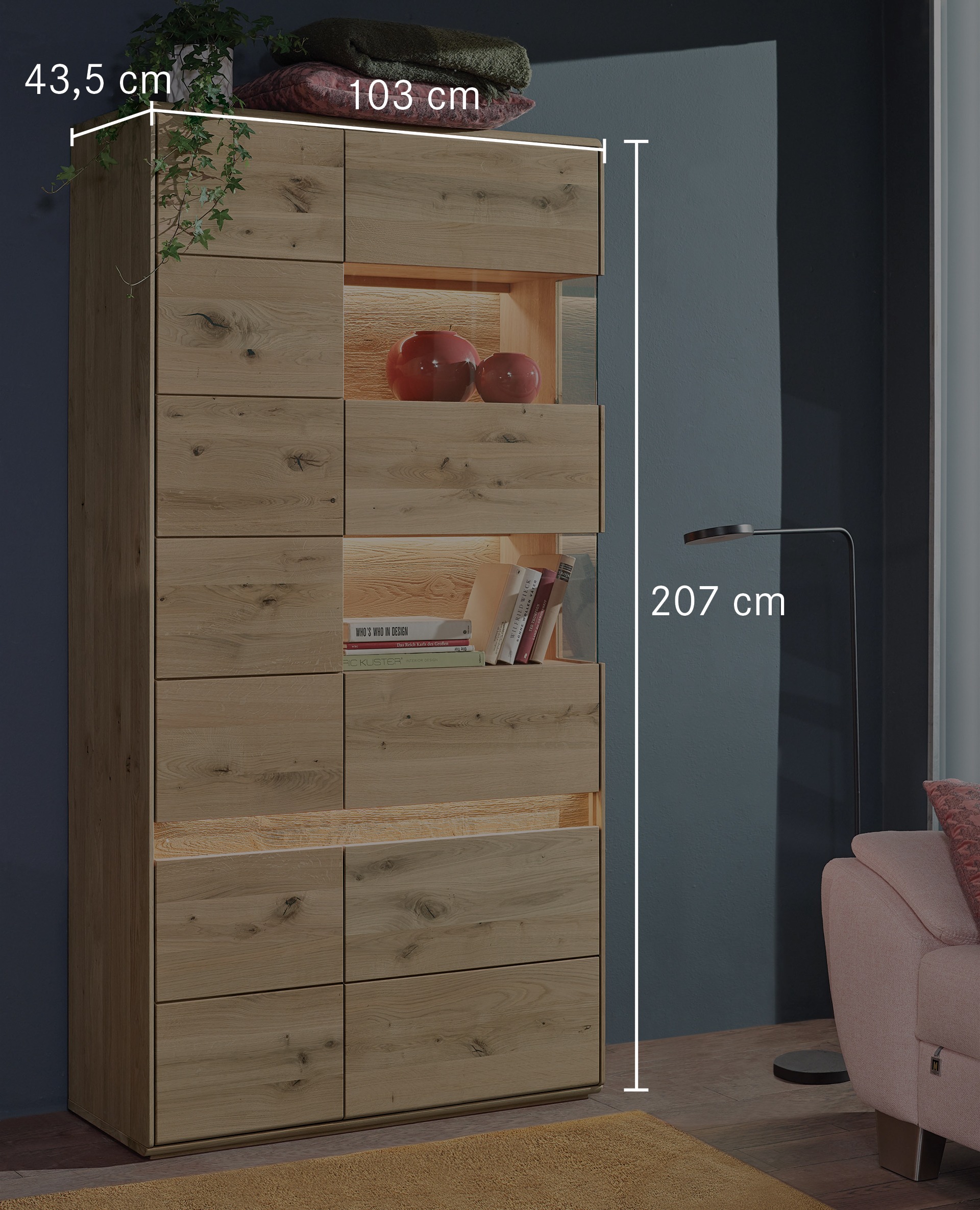 Sichtbare Rückwände und etwaige Applikationen sind aus gebürstetem Massivholz. Hier wird das Holz mit einer Bürste in Faserrichtung bearbeitet. Weiche Holzteile werden dabei sanft abgetragen und nur die härtere Maserung bleibt übrig. So entsteht eine plastische Oberfläche, die besonders natürlich wirkt und Ihnen eine einzigartige Haptik beschert. Vor dieser atemberaubenden Kulisse werden Ihre liebgewonnenen Dekostücke hinter zwei Glasscheiben faszinierend in Szene gesetzt. Je nach Variante findet sich hinter zwei oder vier Türen noch jede Menge Platz für Geschirr, Vasen und sonstigen Krimskrams. Das lebhafte Kernbuchen- oder edle Wildeichenholz bringt natürlichen Charme in Ihr Zuhause. Verwirklichen Sie mit Programm "Bassano" Ihren ganz persönlichen Wohntraum.