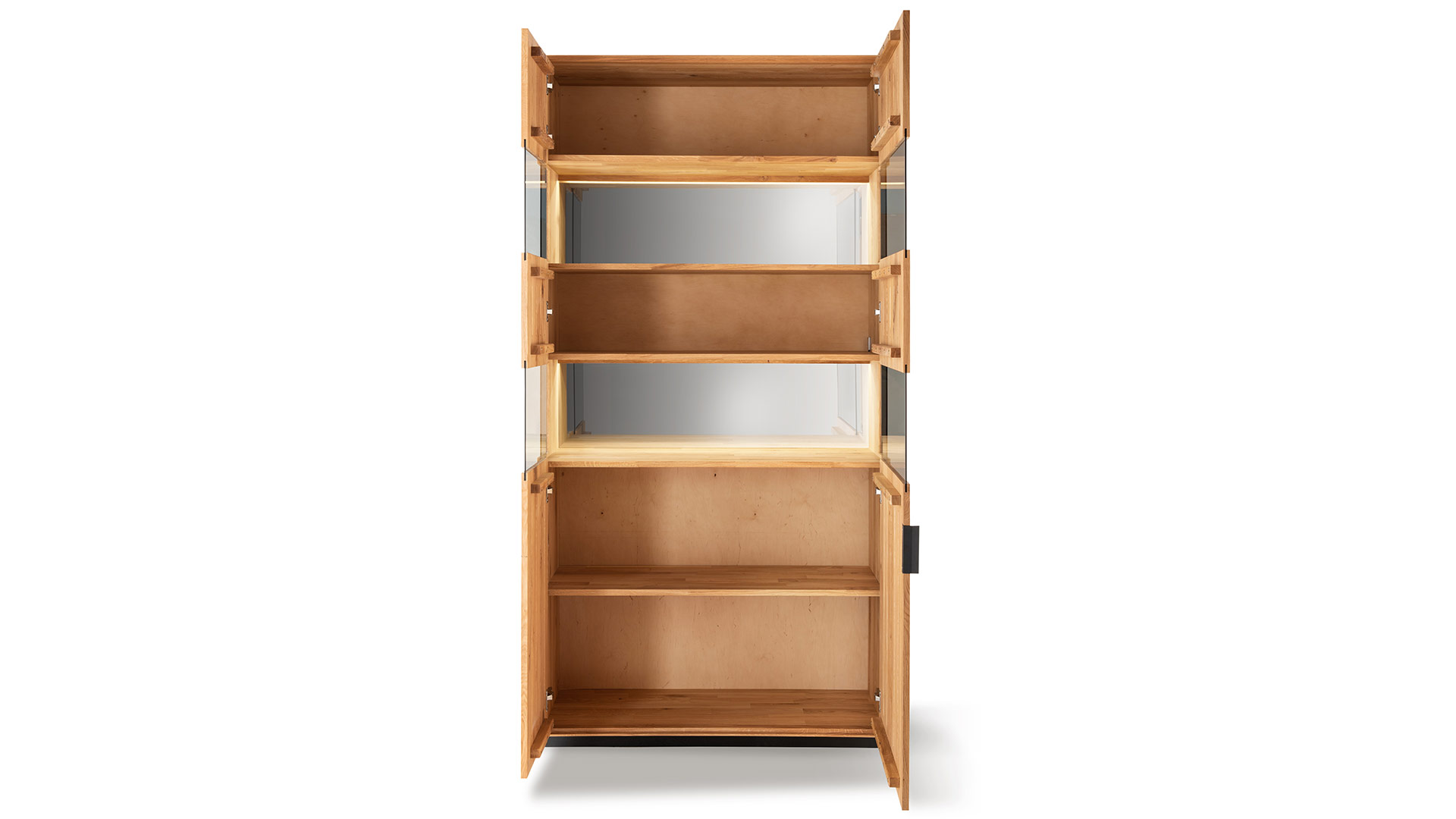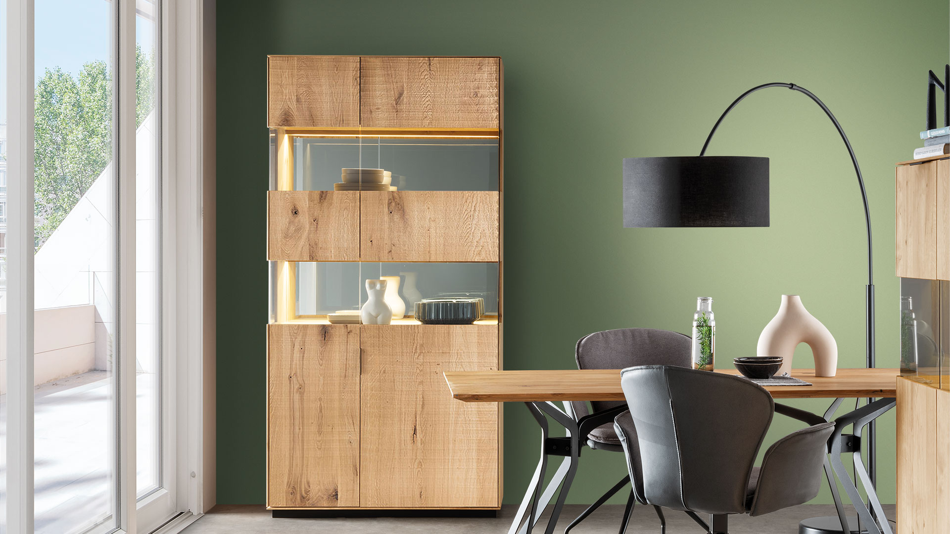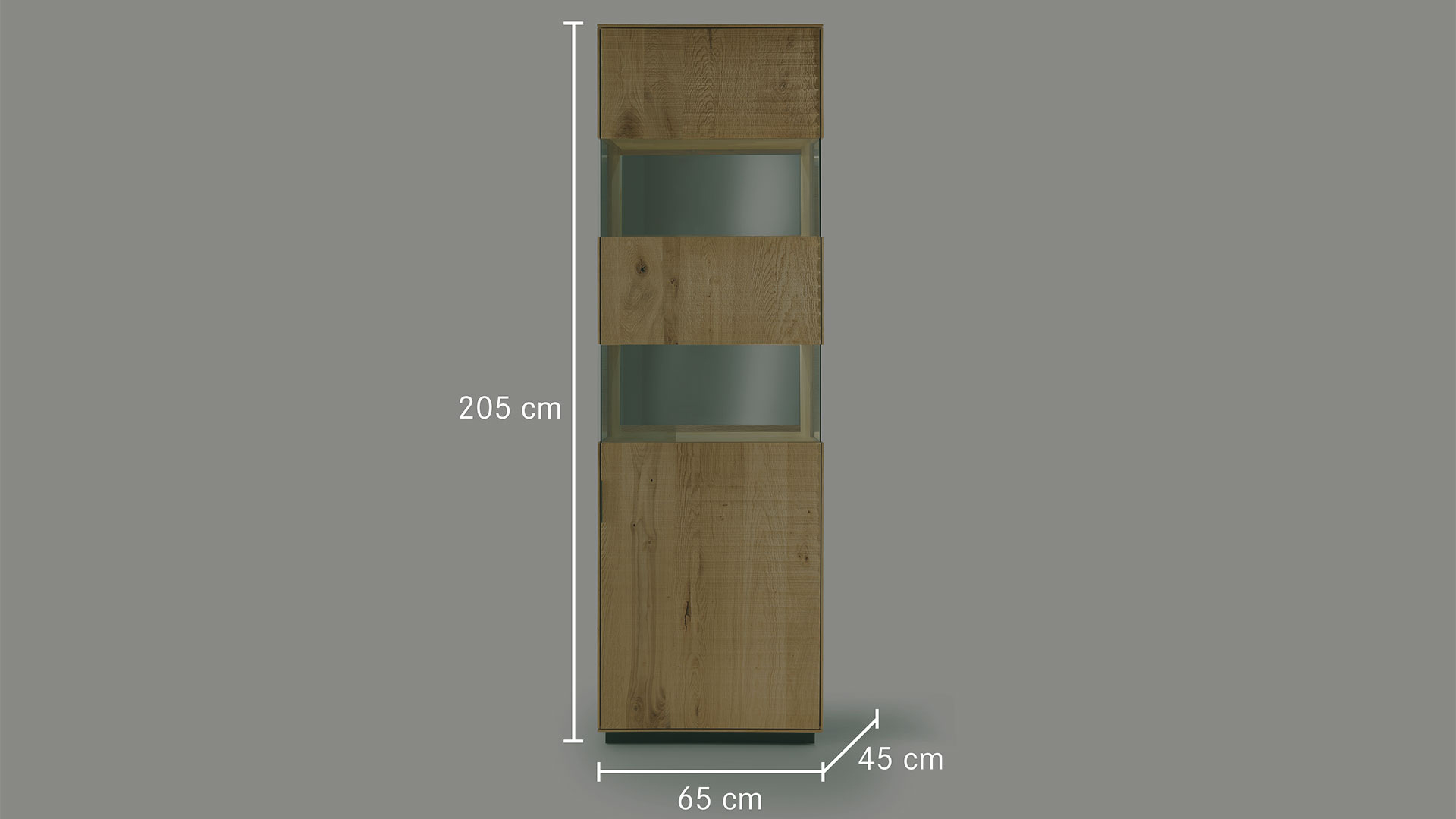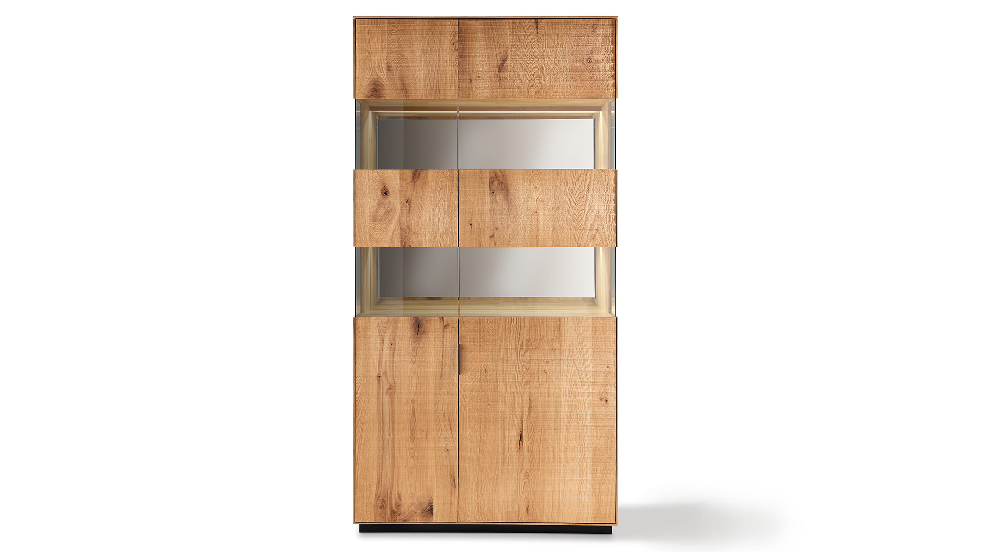 Vitrine "Eterna" vereint naturnahe Wärme mit stilvoller Raffinesse. Das massive Wildeichenholz mit rauer Hobelschlag-Oberfläche verleiht in Zusammenspiel mit den Glaselementen eine einzigartige Ausstrahlung. Die Glaselemente haben Spiegel an den Rückwänden und eine LED-Beleuchtung - so können Sie Ihre Schmuckstücke und Dekoartikel wunderschön in Szene setzen.