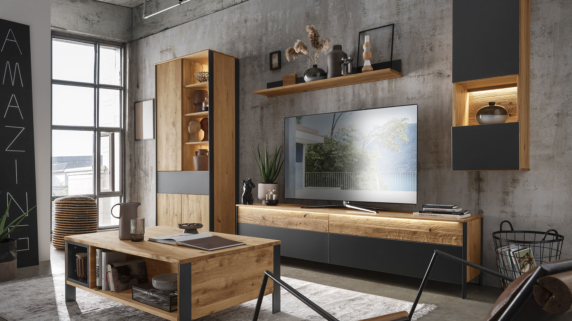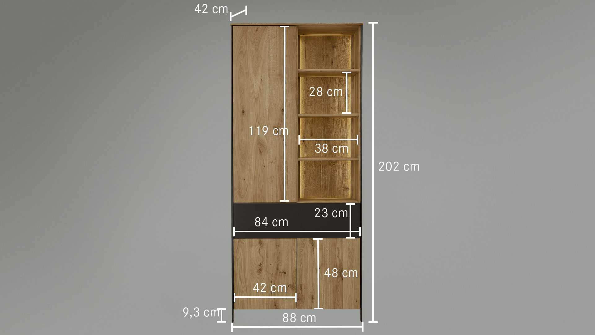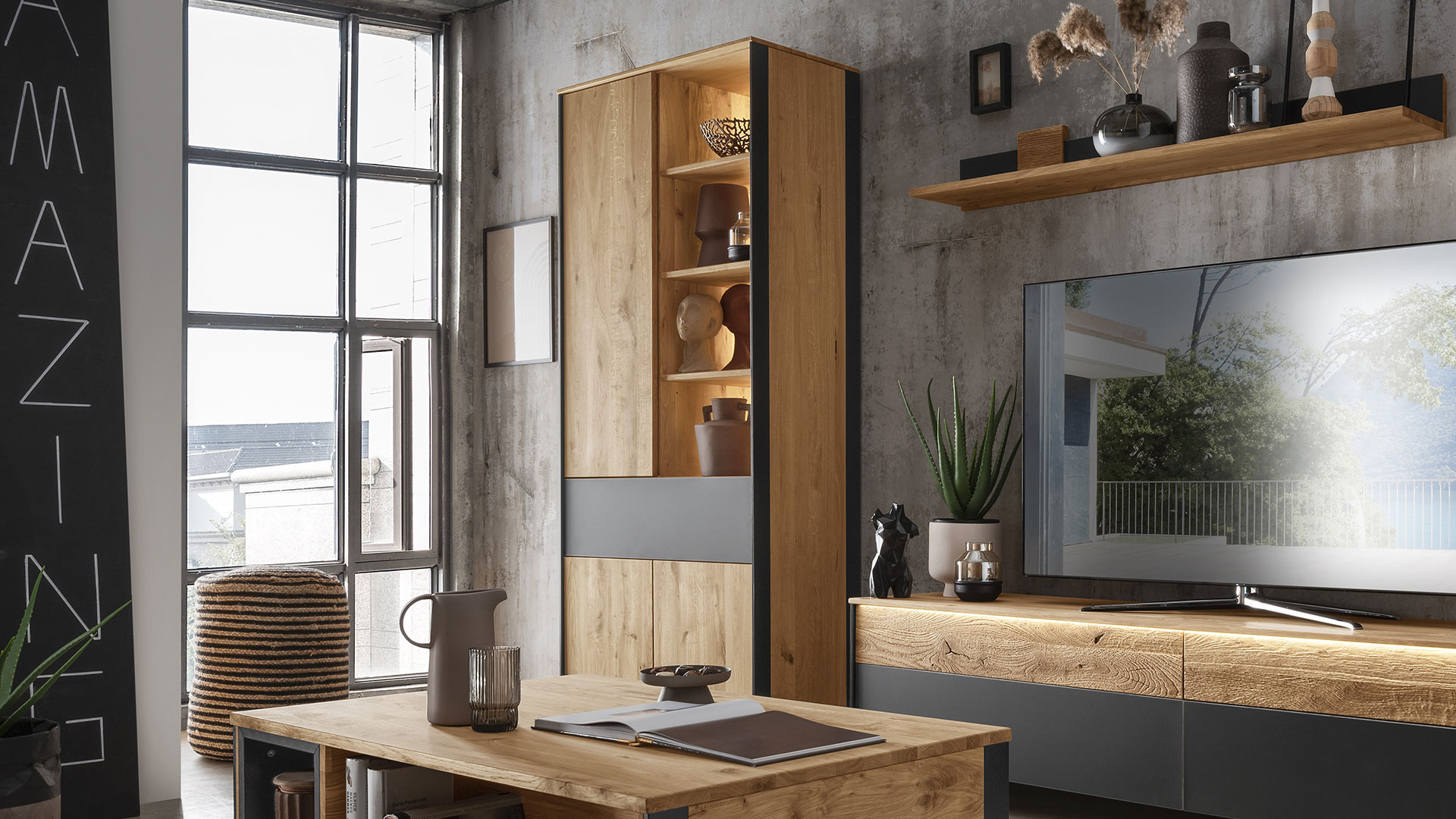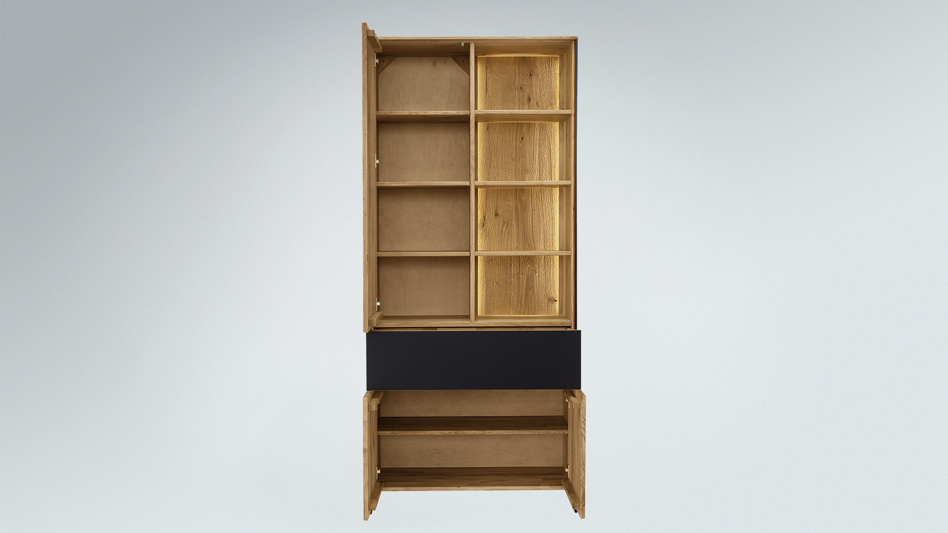 Die Verbindung der warmen Töne des massiven Wildeichenholzes mit den Farbakzenten in Anthrazit schafft einen modernen und doch naturverbundenen Look. Auch in der Funktionalität steht die Vitrine ihrer Optik in nichts nach. Die Schranktüren und Schubladen lassen sich einfach per Tip-On-Funktion öffnen. Die offenen Regalfächer haben eine integrierte LED-Beleuchtung, die in Kombination mit der Rückwand aus geschropptem Holz ein einzigartiges Spiel aus Licht und Schatten zaubert. Die schlanken Füße aus schwarz-lackiertem Holz sind gekonnt in den Korpus integriert und runden das Gesamtbild der Vitrine dezent ab.