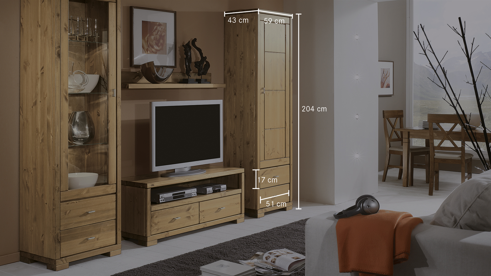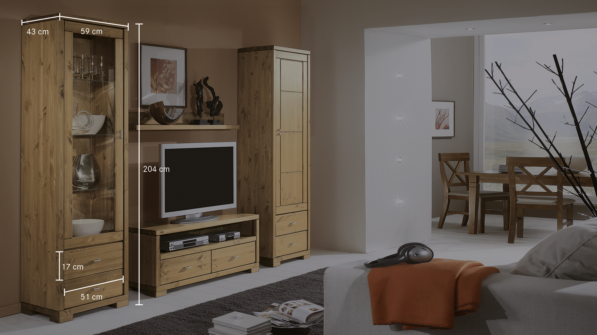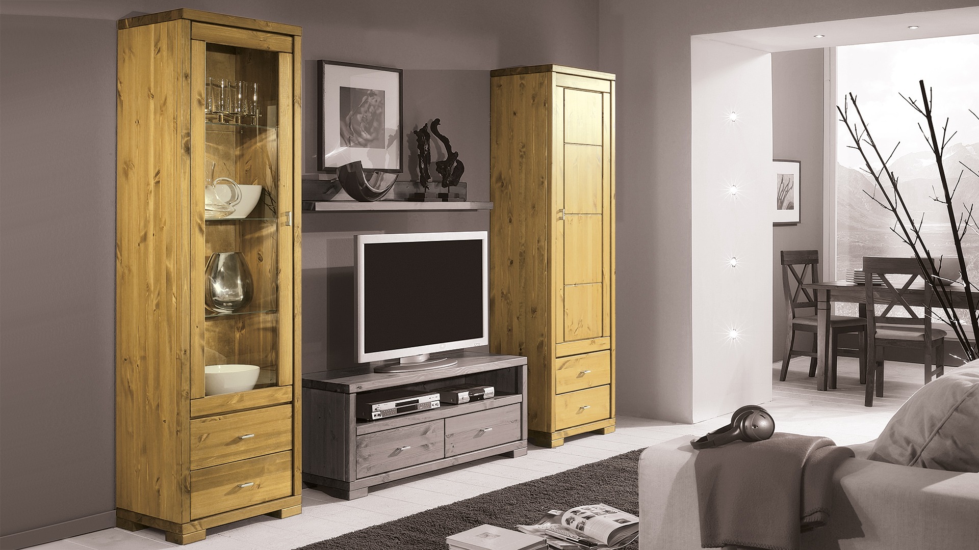 Mit dem Programm "Mascella" entscheiden Sie sich für Produkte, die ein stilvolles Ambiente im Ess- und Wohnbereich zaubern. Die Türen und Schubladen der Vitrinen werden an formschönen Metall-Griffen geöffnet, welche besonders auf der gelaugt/geölten Oberfläche einen wunderbaren, kühlen Kontrast zum warmen Holzton setzen. Auch auf der weiß-lasierten Kiefer wirken die Metall-Griffe äußerst edel. Die Schubladen sind mit einem praktischen Vollauszug ausgestattet, der uneingeschränkten Zugriff auf den gesamten Schubladen-Inhalt gewährt.