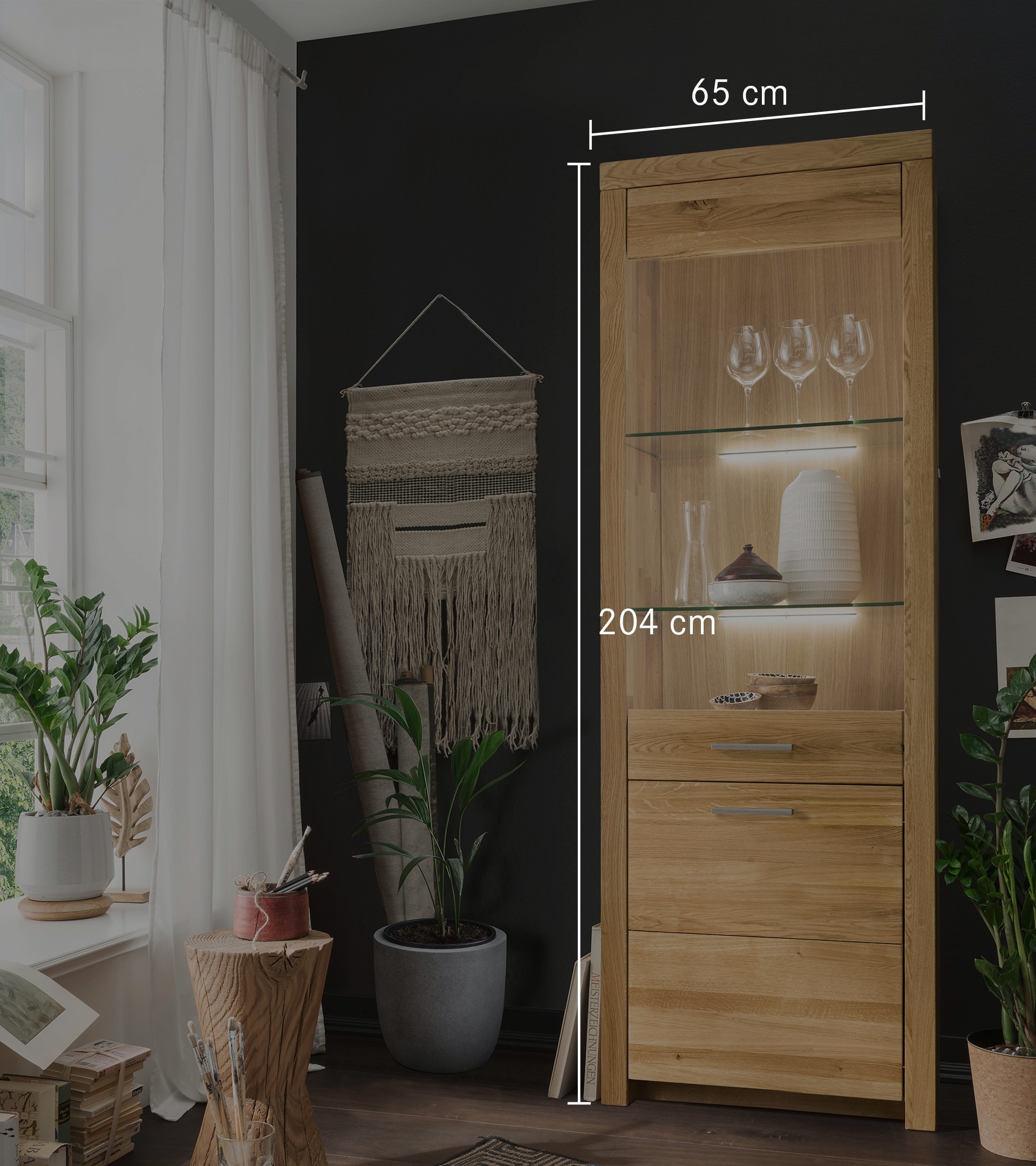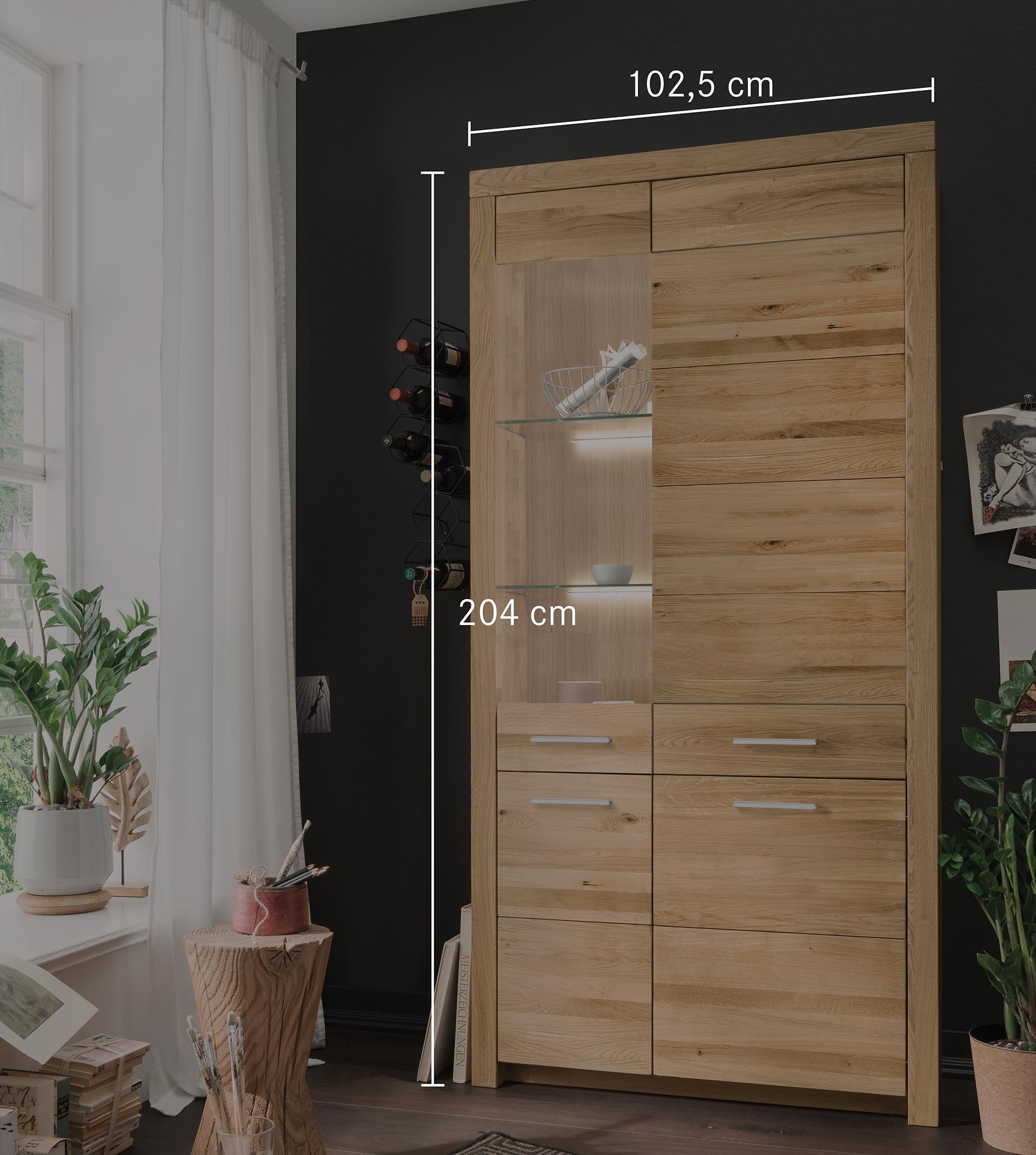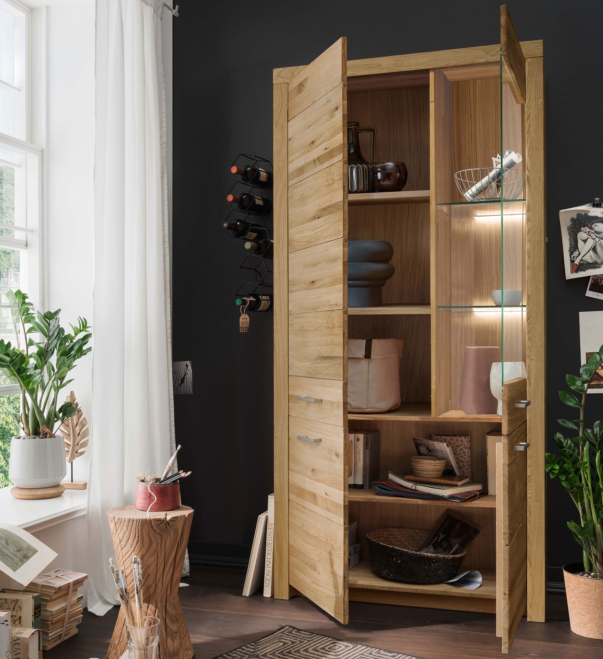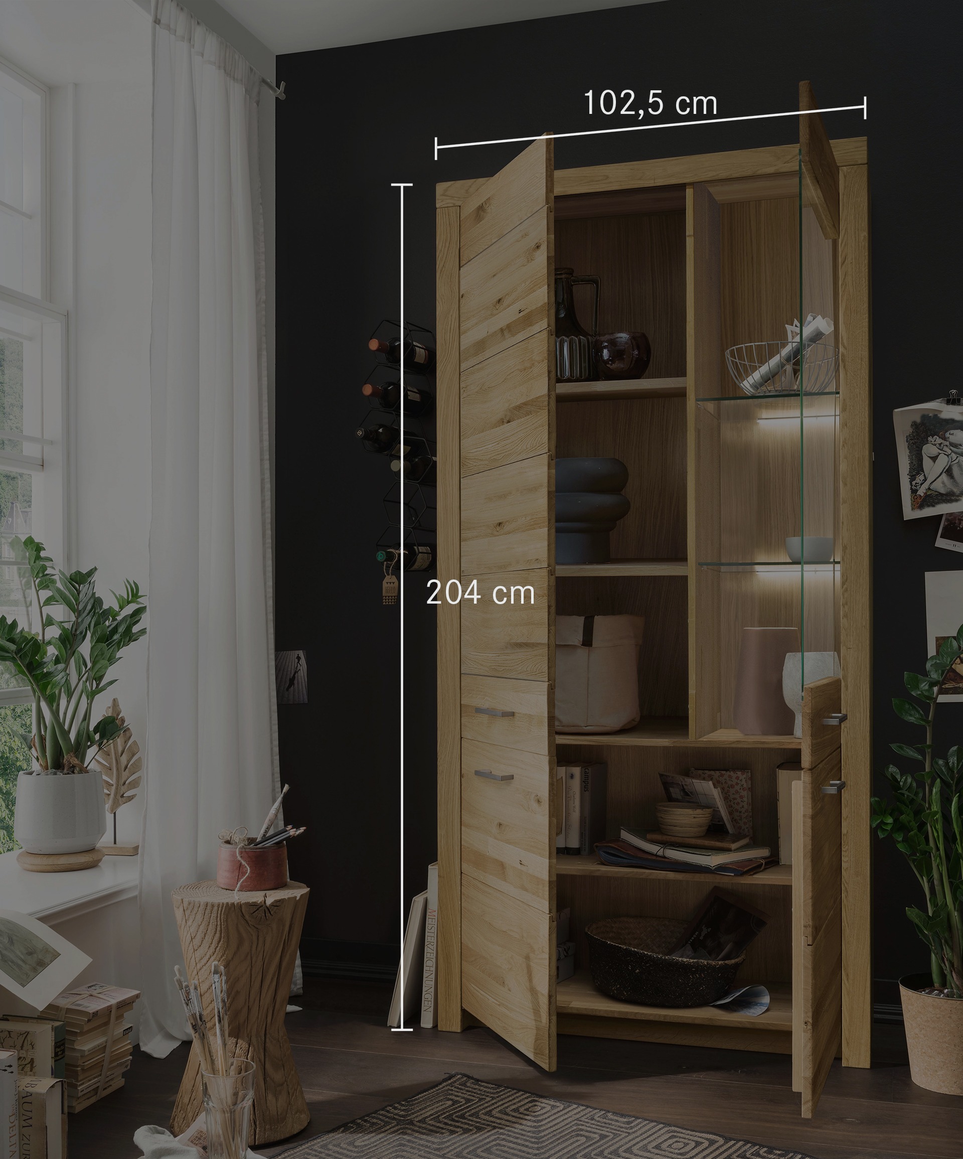 Dann ist die optionale Beleuchtung genau das Richtige für Sie! Gläser, liebgewonnene Mitbringsel oder die Eintrittskarte vom Lieblingskonzert finden hier ihr angemessenes Ambiente. Doch damit nicht genug - hinter den massiven Holztüren findet sich viel praktischer Stauraum.