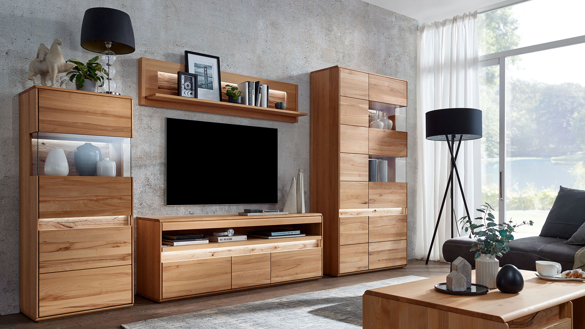 Das lebhafte Kernbuchen- oder edle Wildeichenholz bringt natürlichen Charme in Ihr Zuhause. Dieses Möbelprogramm hält allerdings noch etwas ganz Besonderes für Sie bereit. Sichtbare Rückwände und etwaige Applikationen sind aus gebürstetem Massivholz. Hier wird das Holz mit einer Bürste in Faserrichtung bearbeitet. Weiche Holzteile werden dabei sanft abgetragen und nur die härtere Maserung bleibt übrig. So entsteht eine plastische Oberfläche, die besonders natürlich wirkt und Ihnen eine einzigartige Haptik beschert. Verwirklichen Sie mit Programm "Bassano" Ihren ganz persönlichen Wohntraum.