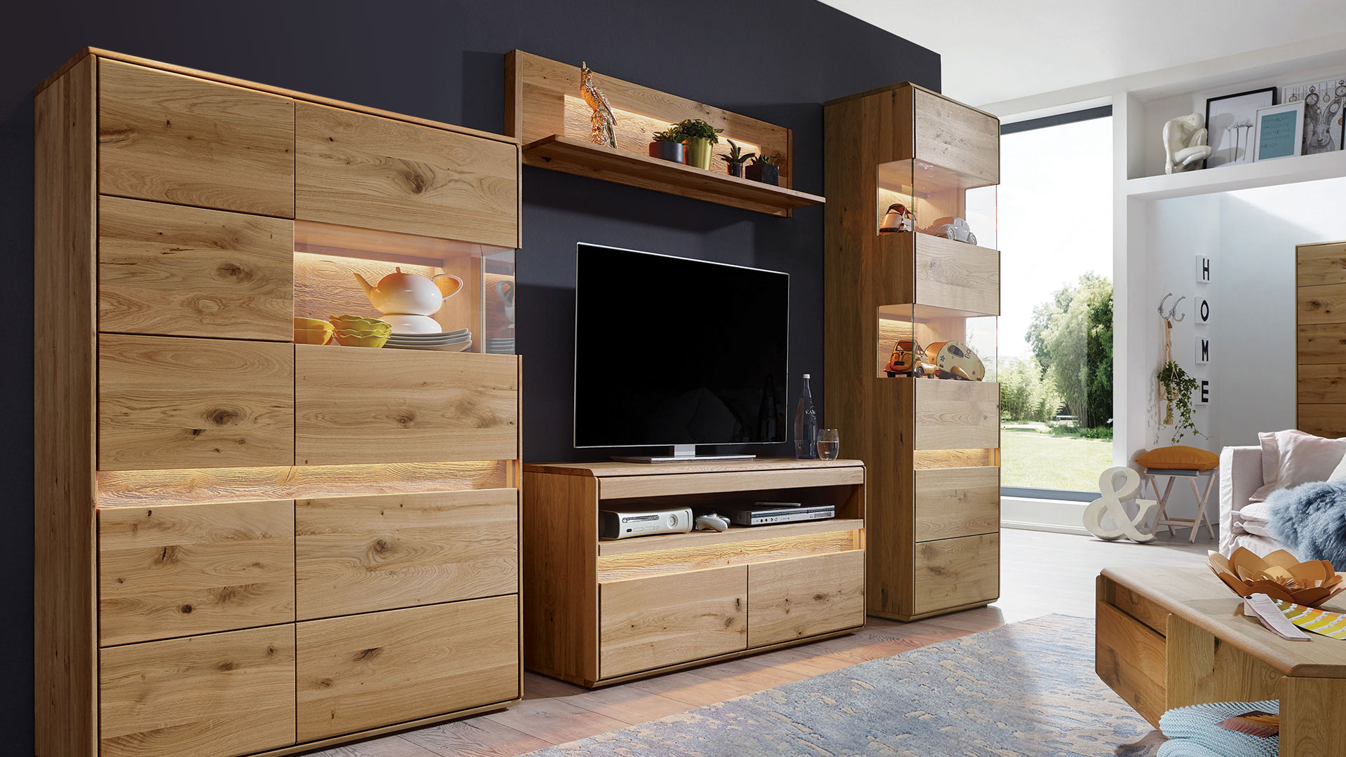 ... denn dieses beleuchtete Wandregal stellt alles in den Schatten. Die Massivholz-Applikation der Rückwand wird stilvoll beleuchtet. Auch Ihre Deko-Schätze werden in liebevolles Licht getaucht und werden so zum attraktiven Hingucker. Wählen Sie aus drei Varianten Ihren Favoriten. Dieses Wandregal ist wahrlich ein Möbel-Schmuckstück der Extraklasse.
