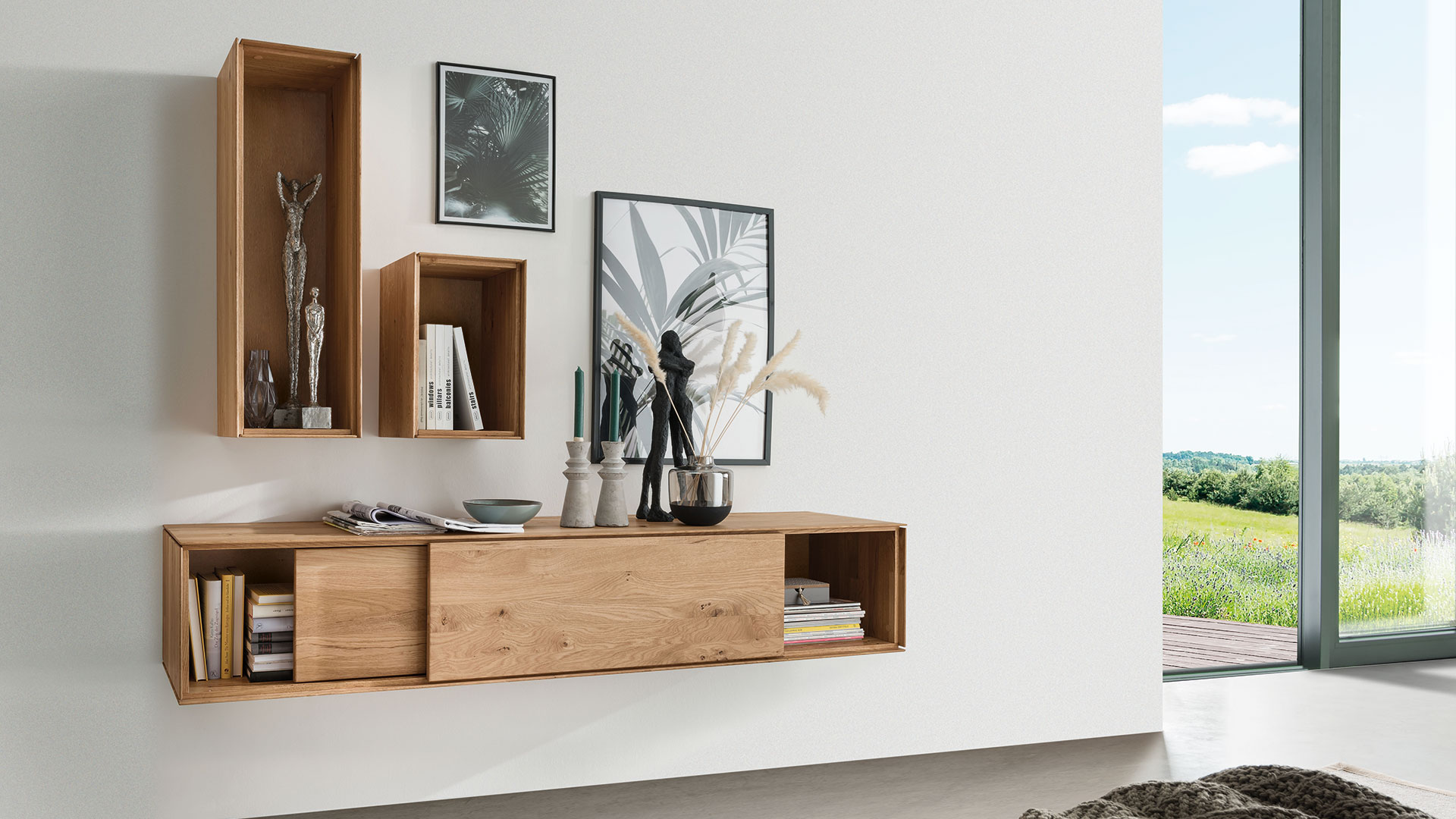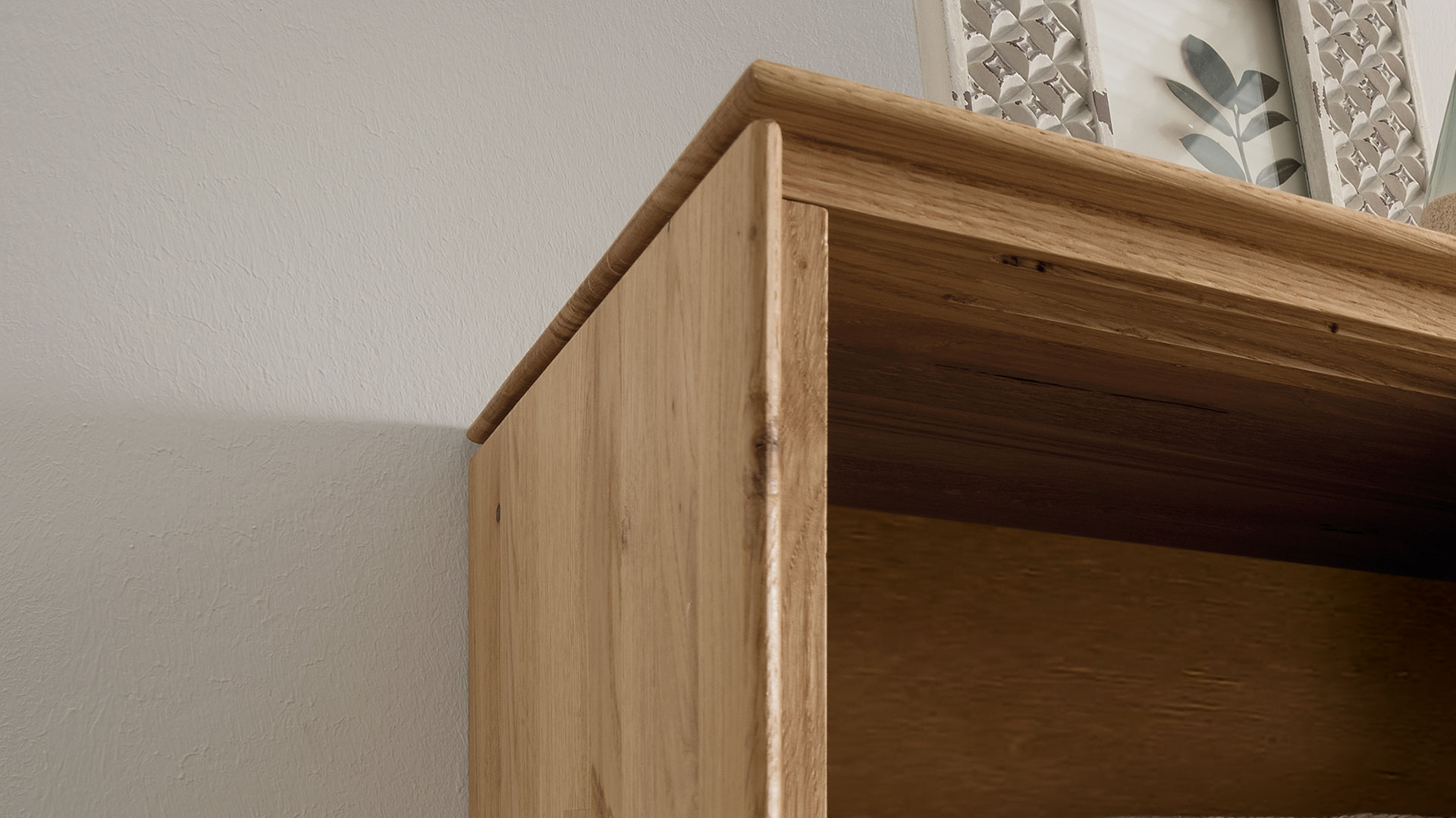 "Civenna" spiegelt Leichtigkeit und Moderne wider. Die klare Formensprache stellt Verarbeitung und Holzcharakter in den Vordergrund. Der an den Vorderkanten ausgefräste Korpus unterstreicht das elegante Gesamtkonzept.