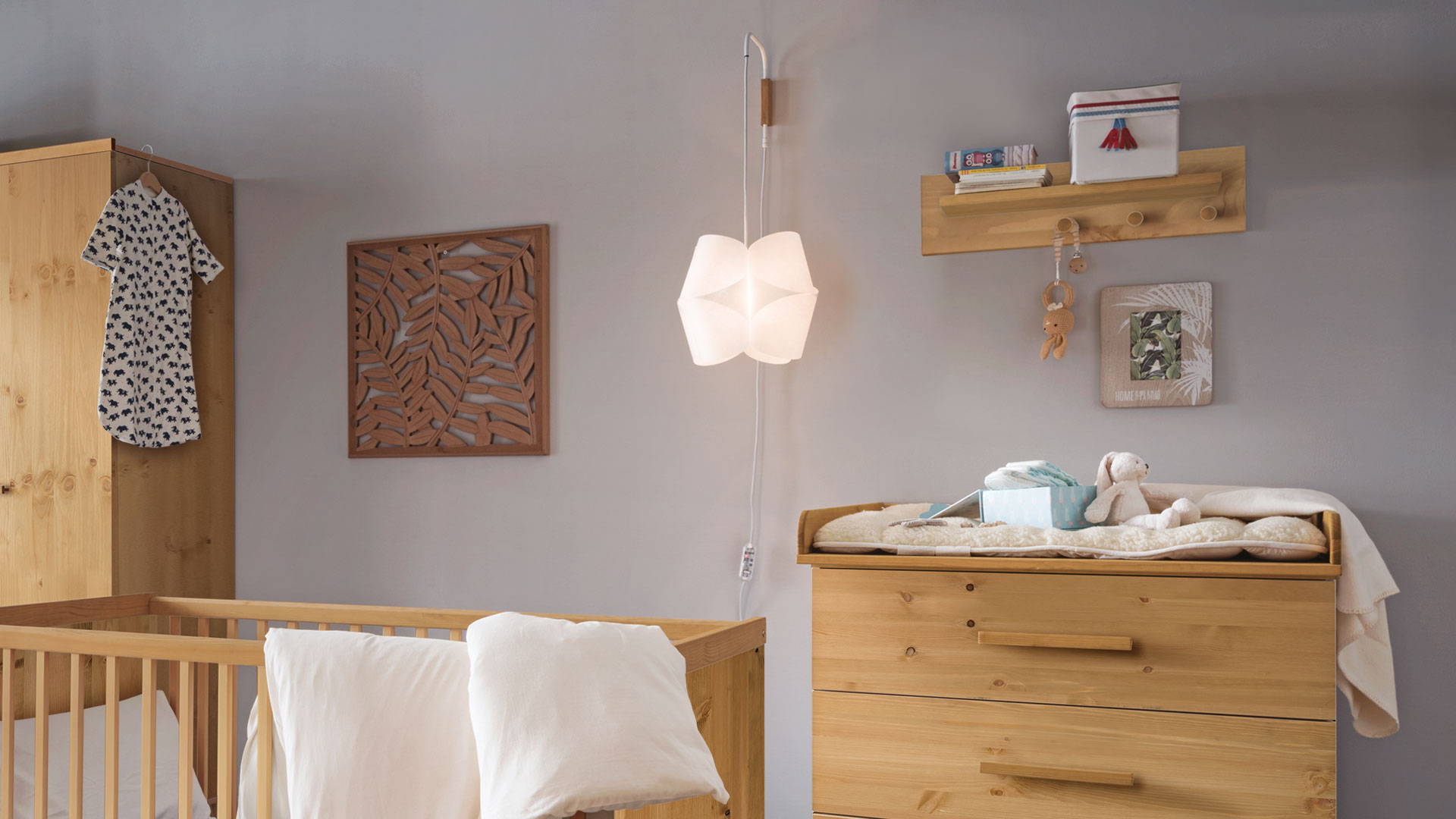 Das Wandpaneel mit eingearbeitetem Regalboden und 3 Holzknöpfen als Haken bietet praktischen Stauraum z.B. über dem Wickeltisch.
