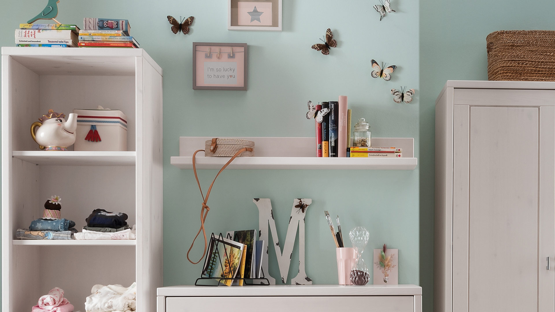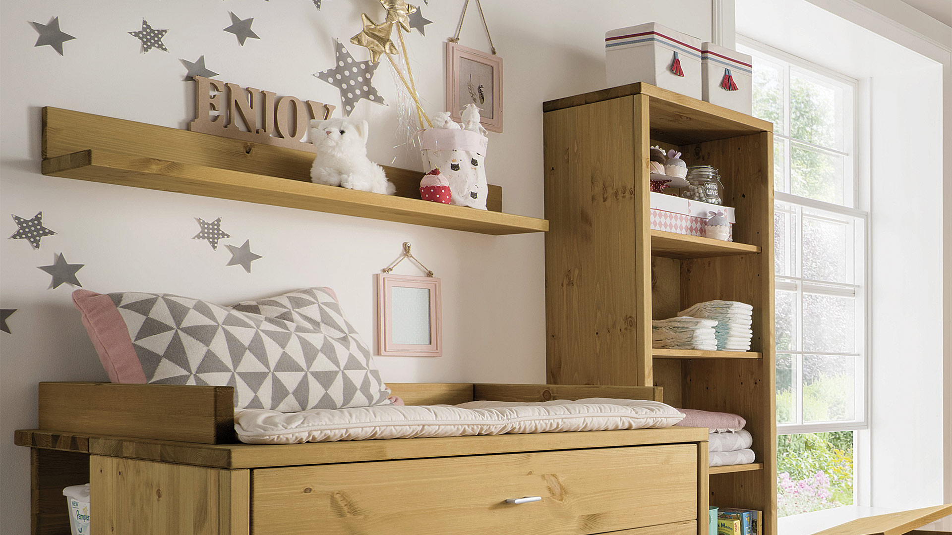 Das schlichte Wandregal "Piccolino" findet gewiss in jedem Babyzimmer seinen Platz. Auf dieser zusätzlichen Ablagefläche haben Sie Puder, Öl und Pflegezubehör jederzeit sofort griffbereit. Je nach Einrichtungs-Stil können Sie zwischen den Oberflächen gelaugt/geölt, weiß-lasiert oder unbehandelt wählen.