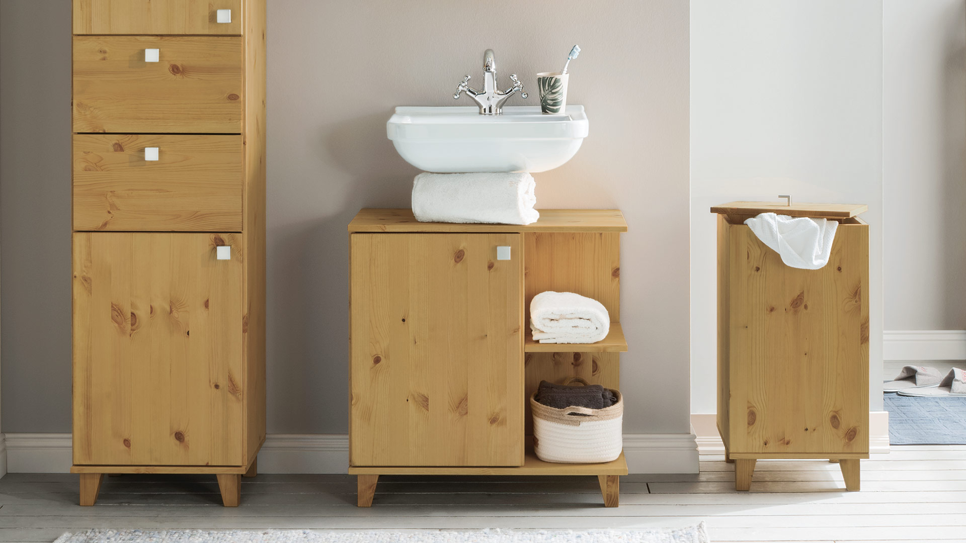 In Anlehnung an den skandinavischen Stil steht "Banea" auf ausgestellten Füßen. Sie finden einen hängenden Unterschrank besser? Dann entscheiden Sie sich einfach für die Variante zum Aufhängen. Geometrische Metall-Winkelgriffe runden das Gesamtbild ab. Mit Variante 01 erhalten Sie einen klassischen Waschbecken-Unterschrank mit Ausschnitt für den Siphon und viel Stauraum. Variante 02 präsentiert das Waschbecken auf dem Tisch. Wer es ganz geräumig liebt, wird sich für die Variante 03 entscheiden. Hier finden gleich zwei Waschbecken Platz und auch sonst ist für genügend Stauraum gesorgt. "Banea" erhalten Sie in massiver Buche oder massiver Kiefer. Das Buchenholz wird geölt. Beim Kiefernholz haben Sie die Wahl: gelaugt/geölt, weiß-lasiert oder weiß-lasiert mit Absetzungen in gelaugt/geölt. "Banea" erhalten Sie exklusiv nur bei allnatura online.