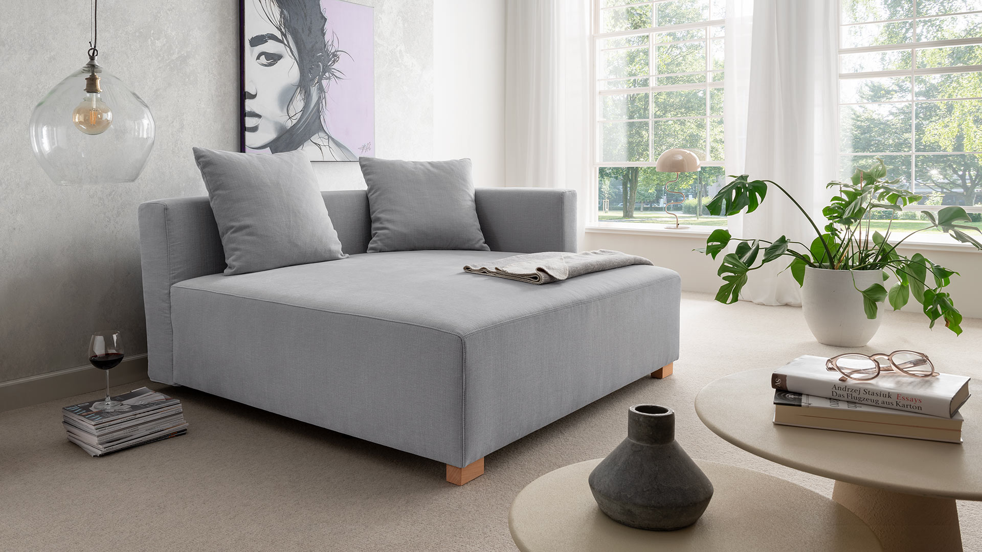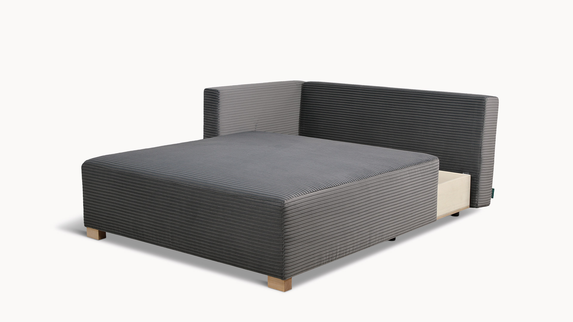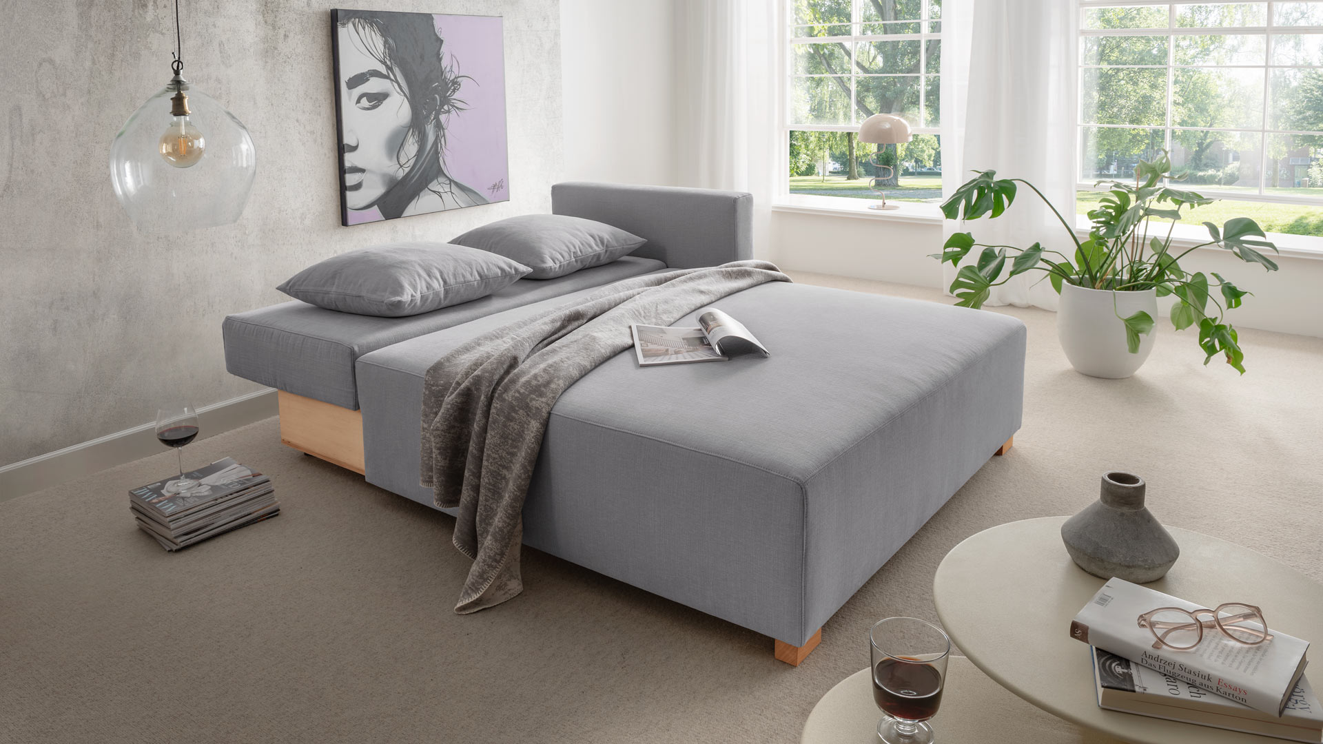 Am Tag ein stylischer Wohlfühlplatz, in der Nacht ein gemütliches Doppelbett: Mit 140 cm Breite bietet die Wohninsel "Plaza" viel Platz zum Entspannen. Bettzeug verschwindet im Handumdrehen im integrierten Bettkasten – für ein aufgeräumtes Wohngefühl.