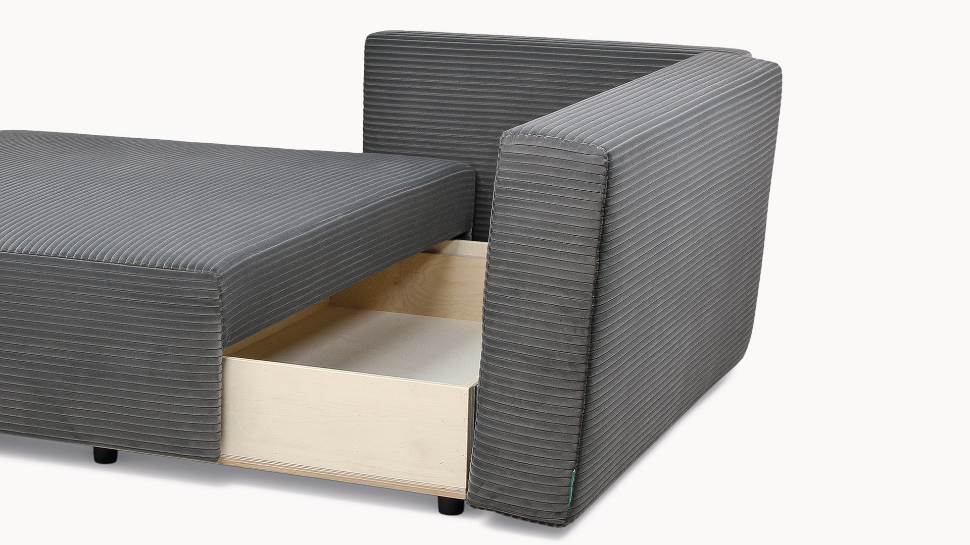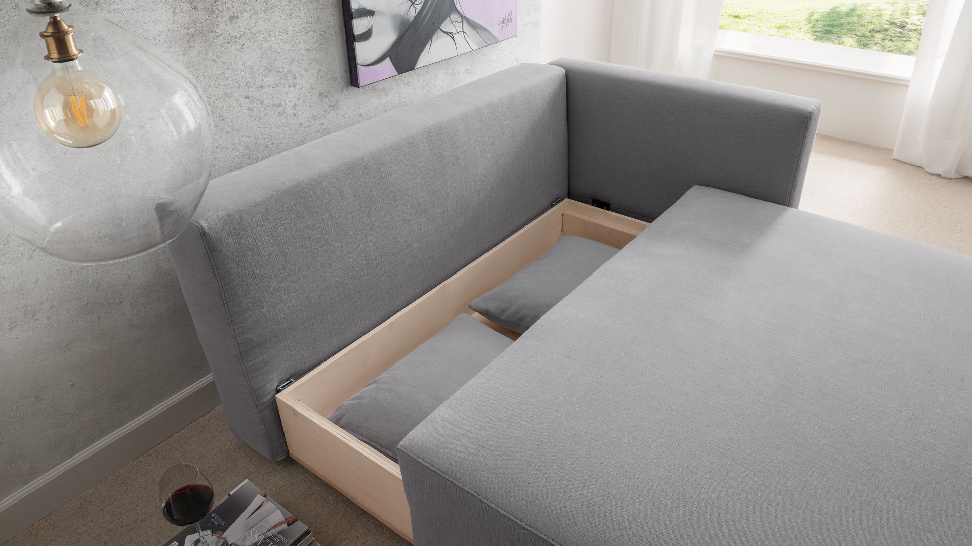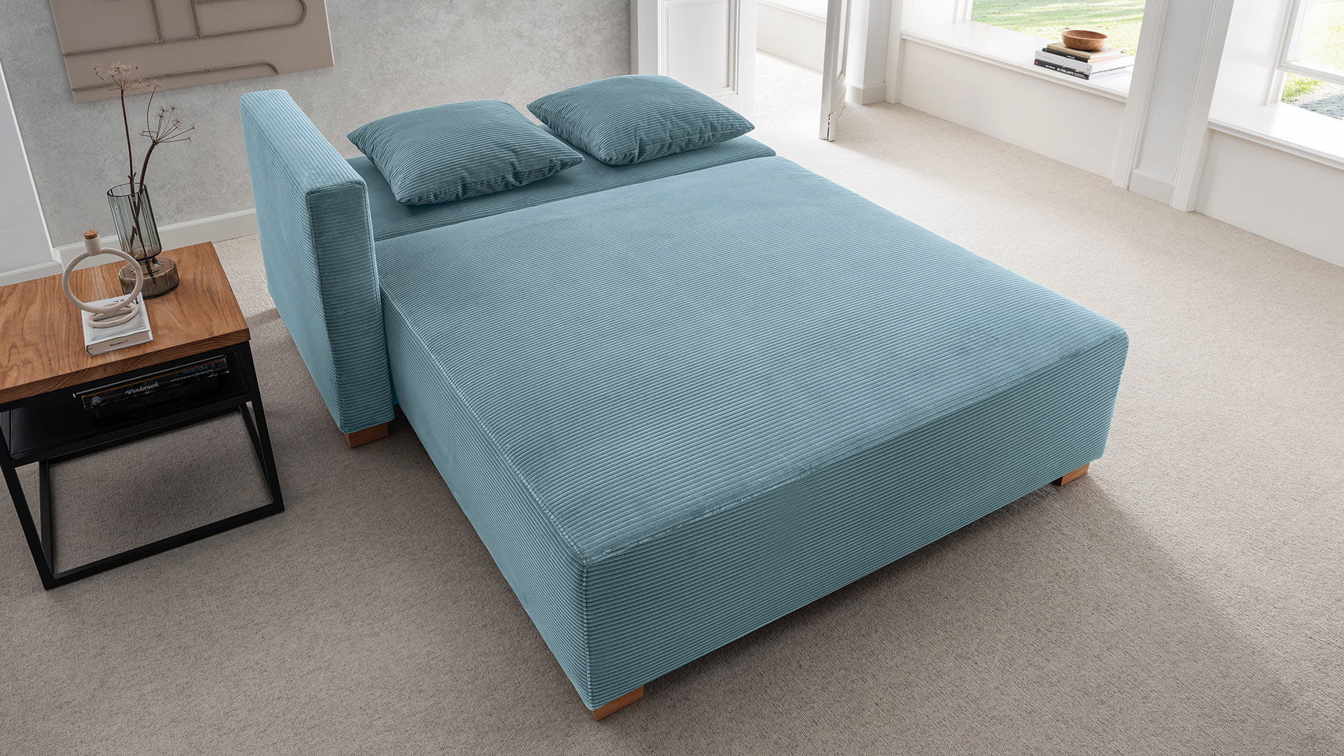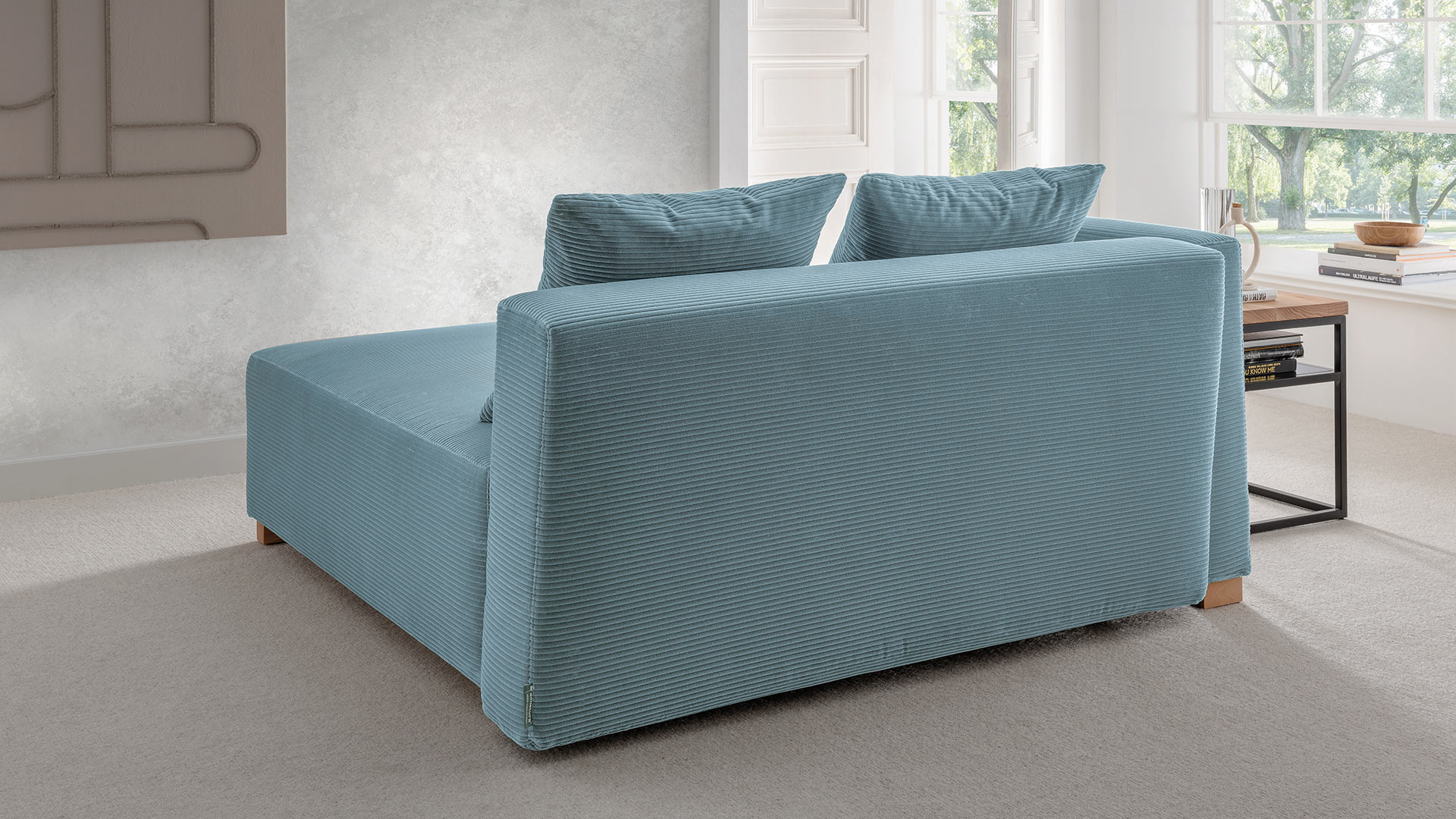 Am Tag ein stylischer Wohlfühlplatz, in der Nacht ein gemütliches Doppelbett: Mit 140 cm Breite bietet die Wohninsel "Plaza" viel Platz zum Entspannen. Bettzeug verschwindet im Handumdrehen im integrierten Bettkasten – für ein aufgeräumtes Wohngefühl.