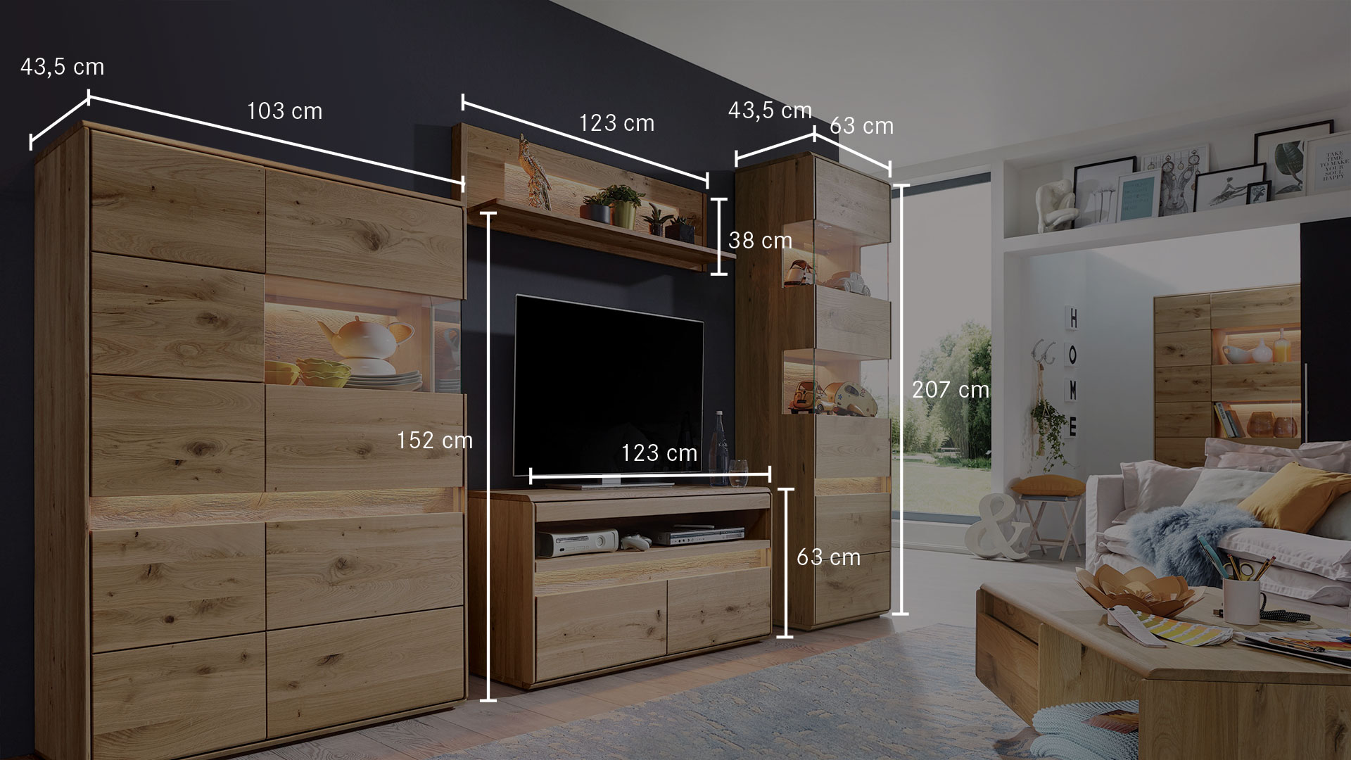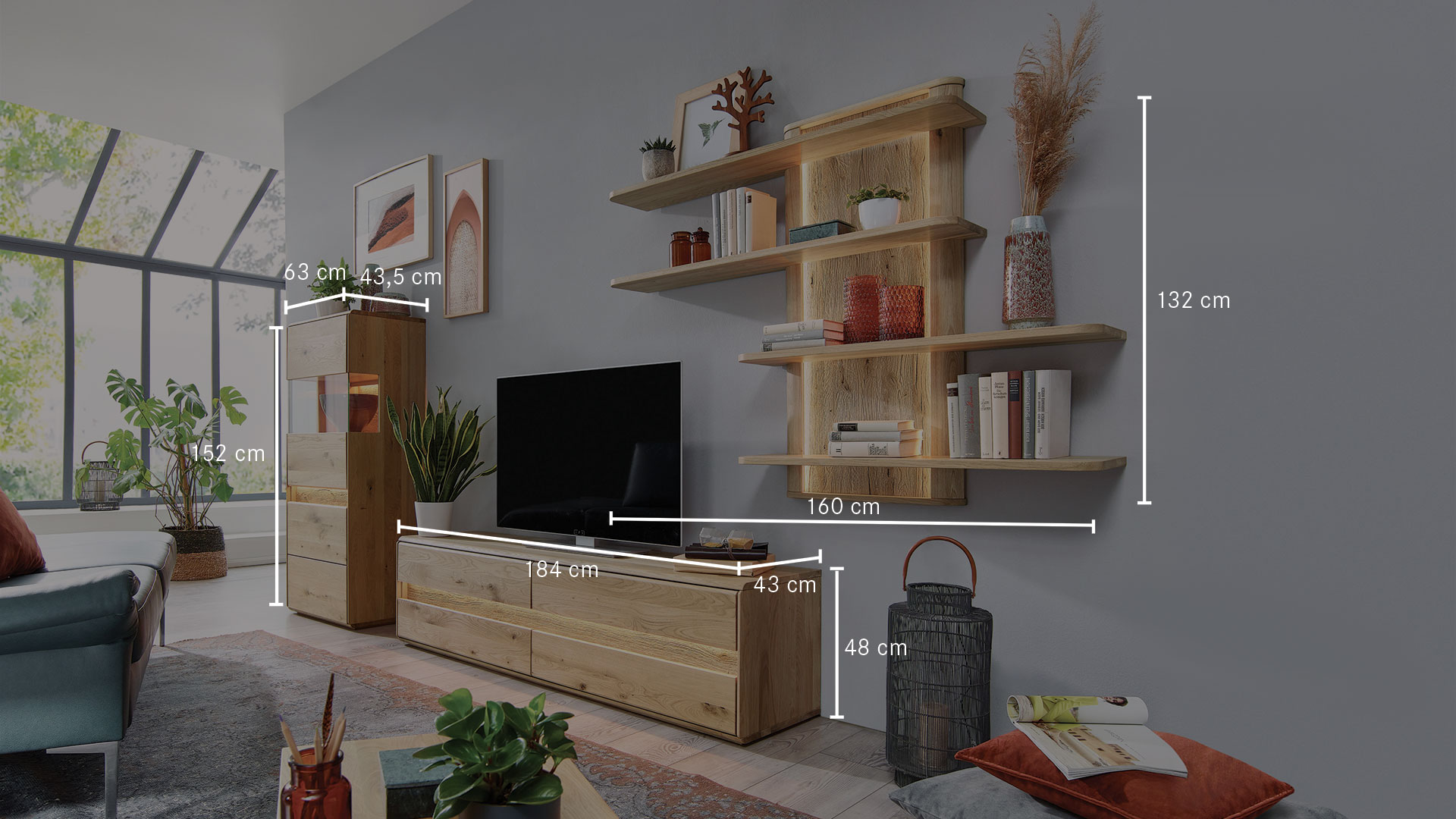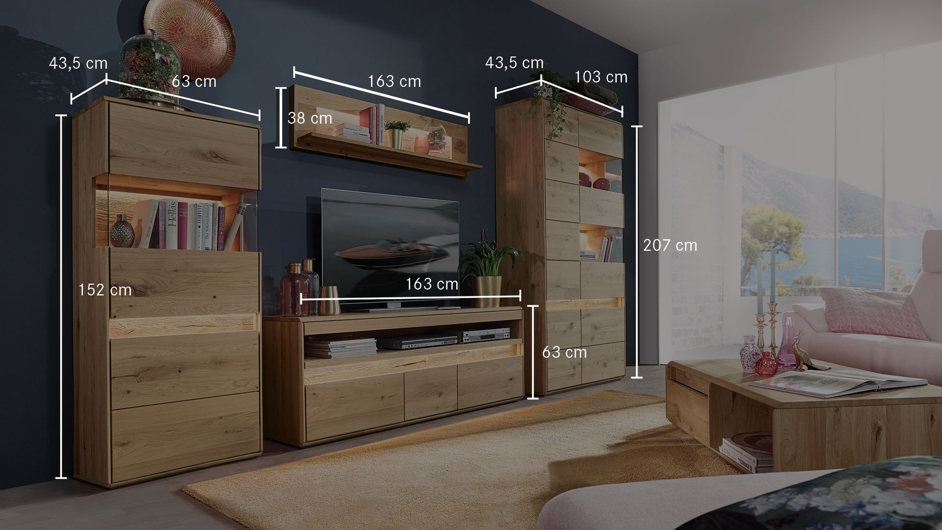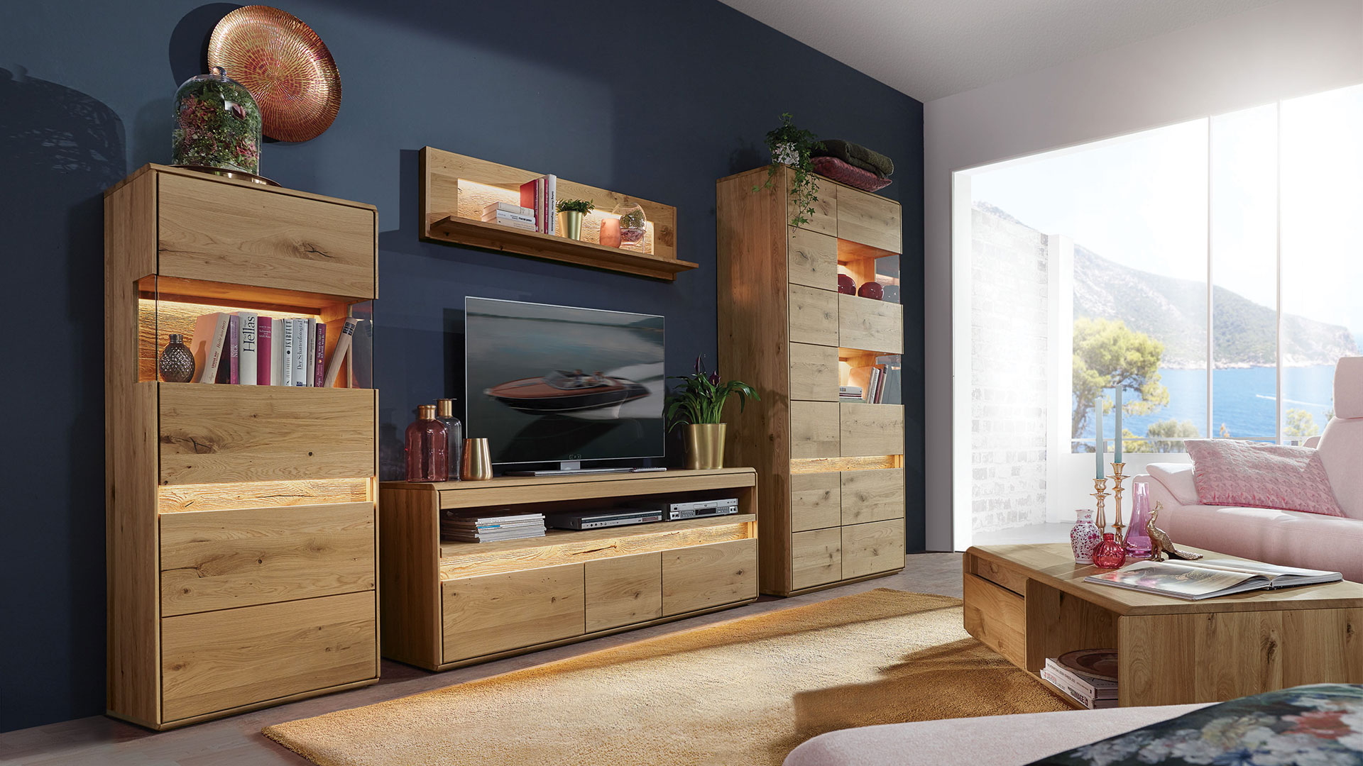 Sichtbare Rückwände und etwaige Applikationen sind aus gebürstetem Massivholz. Hier wird das Holz mit einer Bürste in Faserrichtung bearbeitet. Weiche Holzteile werden dabei sanft abgetragen und nur die härtere Maserung bleibt übrig. So entsteht eine plastische Oberfläche, die besonders natürlich wirkt und Ihnen eine einzigartige Haptik beschert. Das lebhafte Kernbuchen- oder edle Wildeichenholz bringt natürlichen Charme in Ihr Zuhause. Mit Variante 01 erhalten Sie eine schmale Vitrine, ein breites Highboard, ein schmales Lowboard und ein schmales Wandregal. Sie haben etwas mehr Platz zur Verfügung? Dann fällt Ihre Wahl sicherlich auf Variante 02 mit einer breiten Vitrine, einem schmalen Highboard, einem breiten Lowboard und einem breiten Wandregal. Variante 03 überzeugt mit einem schmalen Highboard, einem Lowboard mit vier geräumigen Schubladen und einem extravaganten Wandregal. Egal, wie Sie sich entscheiden - mit den hochwertigen Möbeln aus dem Programm "Bassano" verwirklichen Sie Ihren ganz persönlichen Wohntraum.