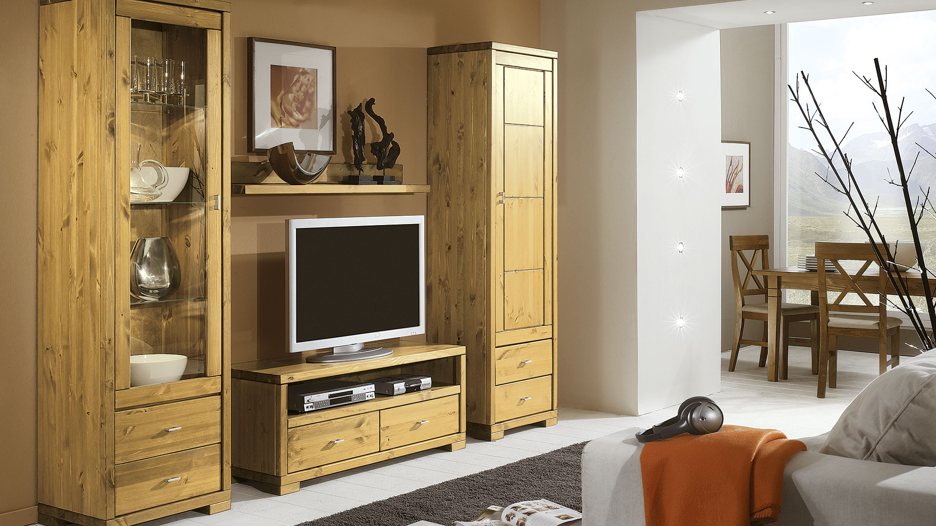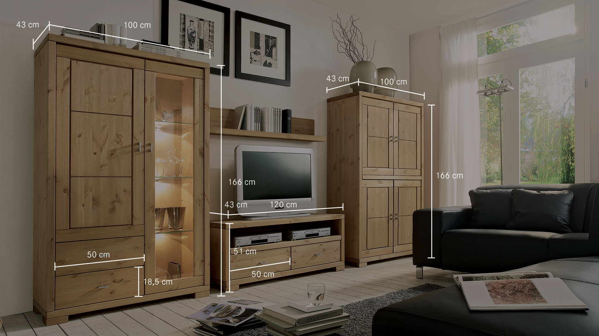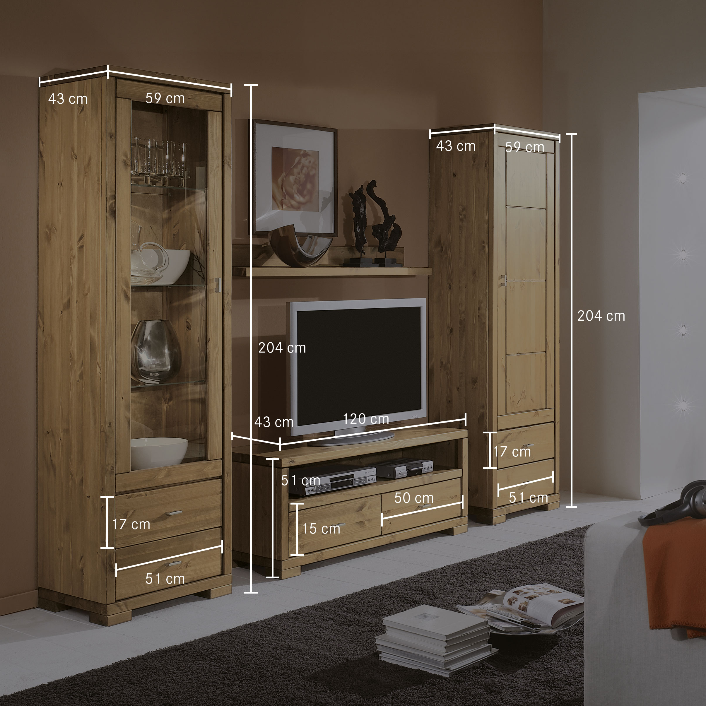 Dann erweitern Sie Ihre Wohnwand einfach mit Ihren Wunschmöbeln aus Wohnmöbel-Programm "Mascella". Mit Wohnwand "Mascella" schaffen Sie sich ein wohnliches und stilvolles Ambiente. Jedes einzelne Möbelstück dieser wertvollen Wohnwand wird in traditioneller Handwerksarbeit gefertigt. Die belebte und kontrastreiche Eigenschaft des Kiefernholzes, bringt einen ganz individuellen Charakter in Ihr Zuhause. "Mascella" ist in 2 Varianten und 2 Oberflächen erhältlich. Alle Holz- und Glasböden der Vitrinen und Highboards sind mittels Reihenlochbohrung höhenverstellbar, so dass Sie die Inneneinteilung individuell anpassen können.