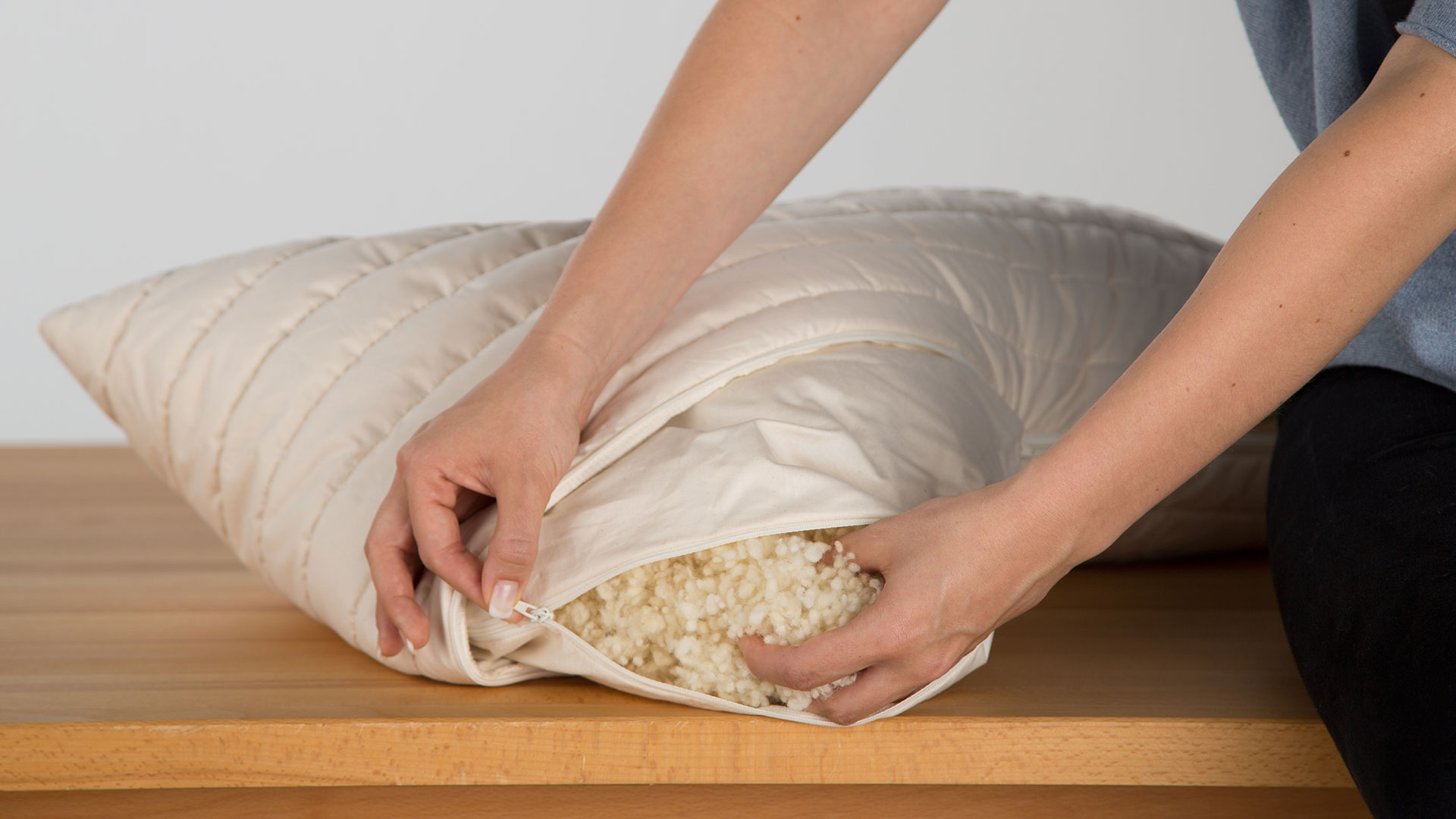 100 % feinste, naturbelassene Schafschurwoll-Kügelchen aus kontrolliert biologischer Tierhaltung - in einem separaten Innenbezug mit Reißverschluss.