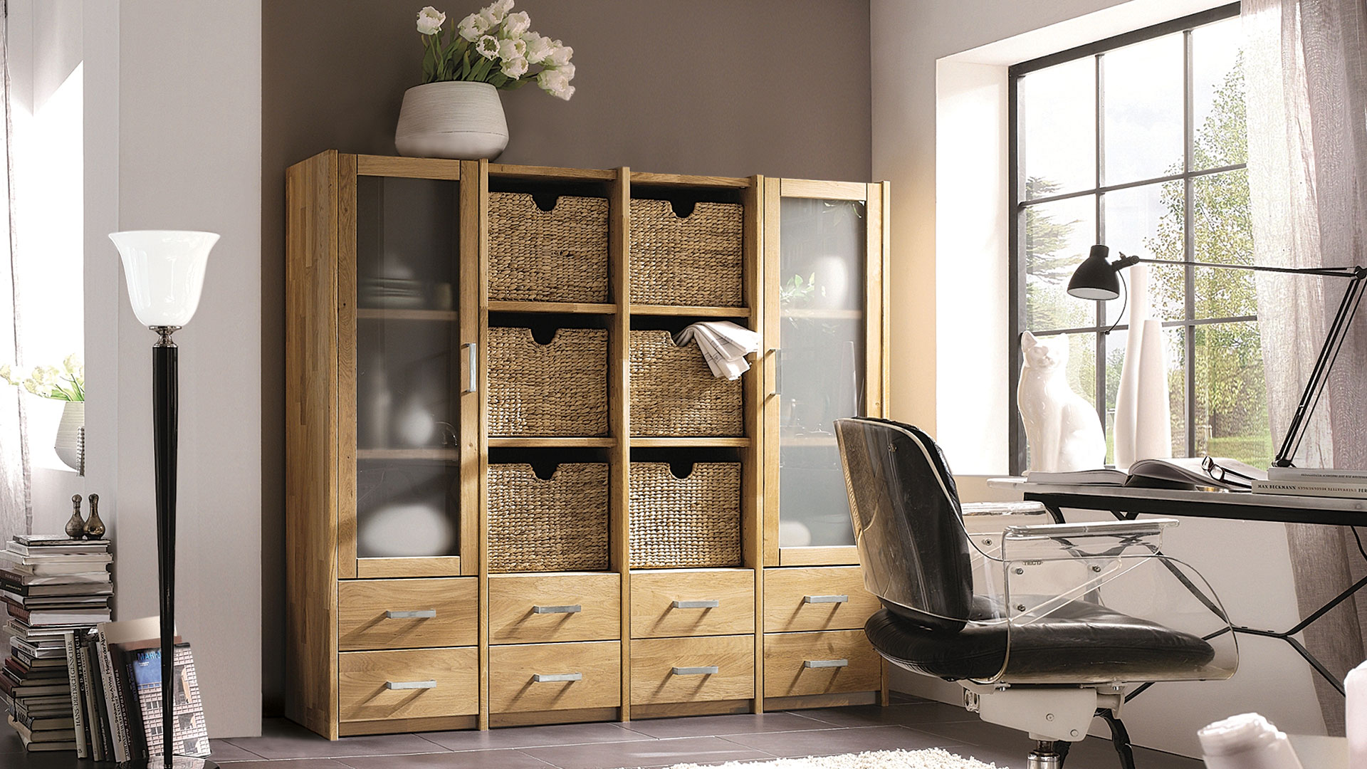 Mit diesem praktischen Zubehör können Sie Ihre Regalwand oder Ihr Regalsystem "Sedes" ganz nach Wunsch ergänzen. Wir bieten Ihnen Glastüren in unterschiedlichen Höhen und Ausführungen, praktische Schubladen und Körbe aus Wasserhyazinthen-Geflecht an. Weitere Böden und Fachböden bieten Ihnen noch mehr Stauraum für Bücher, Geschirr oder Dekoelemente. Mit einem Wandregal können Sie zusätzliche Akzente setzen.
