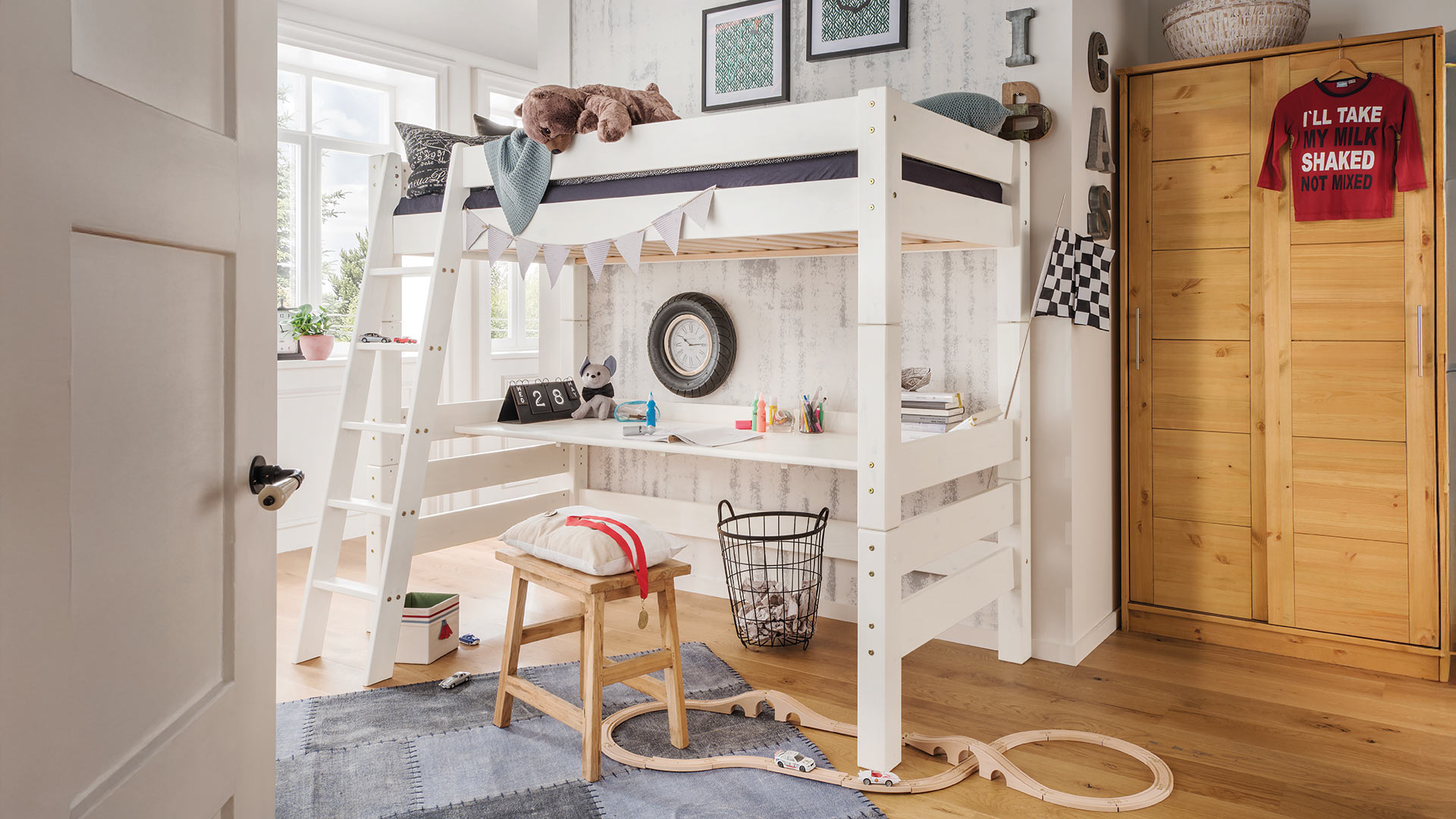 Mit der massiven Schreibtischplatte wird der Raum unter dem Hochbett platzsparend genutzt. An der handlichen Garderobenleiste mit 6 Holzhaken werden Jacken, Taschen und Mützen ordentlich verstaut. Sie können die Leiste wahlweise an einer Bettseite einhängen oder mit den mitgelieferten Haken an der Wand montieren. Mit der Zusatz-Absturzsicherung bieten Sie Ihrem Kind noch mehr Sicherheit, da der obere Bettrahmen um 16 cm erhöht wird.