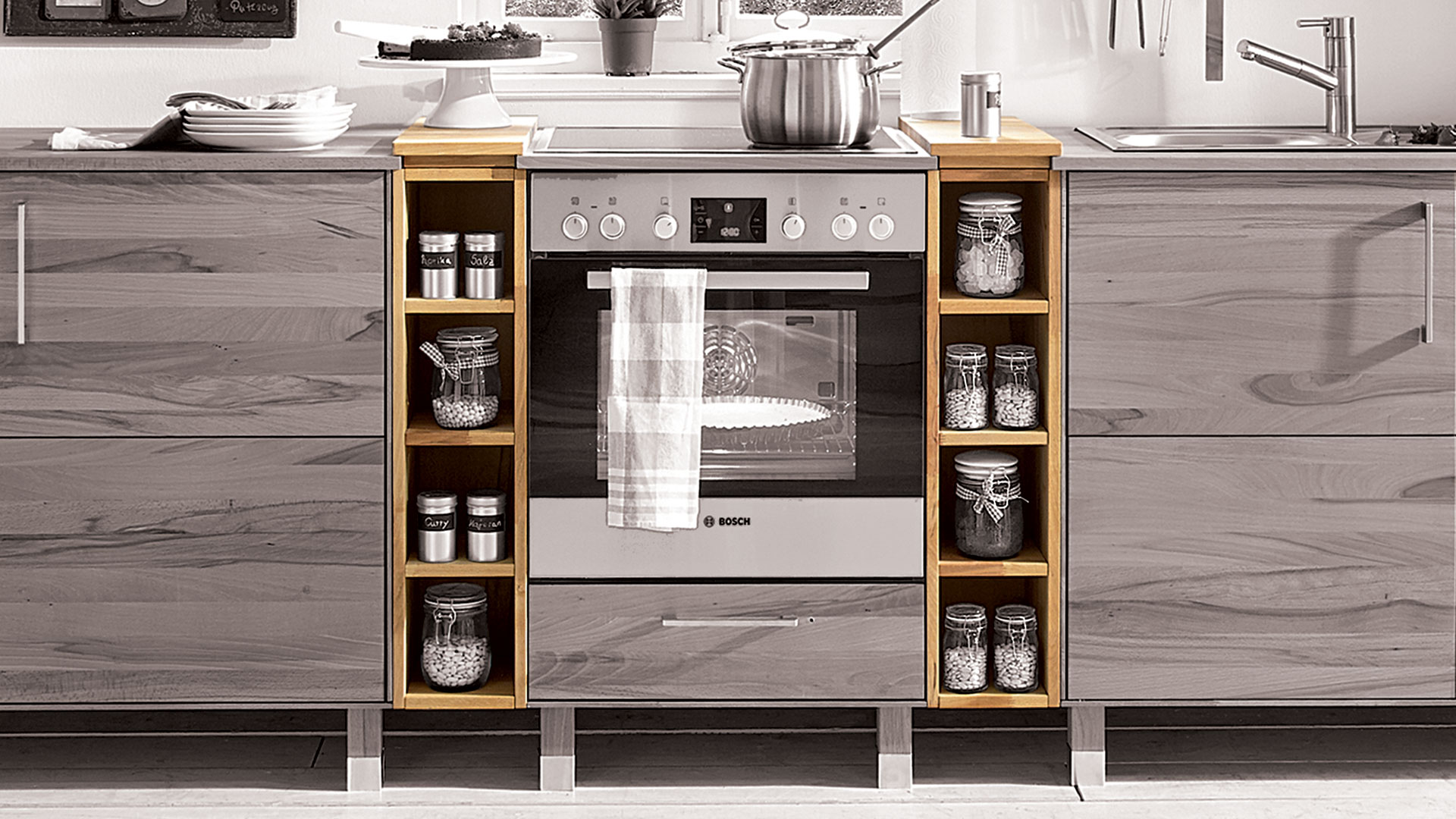Für manche Arbeitsabläufe wünscht man sich aber etwas mehr Zusammenhalt. Dafür gibt es dieses geniale Zwischenmodul. Es wird einfach vorne bündig mit den benachbarten Schrankmodulen verschraubt und mit dem praktischen Schneidebrett abgedeckt. Schaffen Sie so beispielsweise eine geschlossene Verbindung von Herd und Spüle. Auch wenn Sie eine Ecklösung planen, benötigen Sie dieses Zwischenmodul als "Abstandhalter". Nützlichen Regal-Stauraum bietet dieses vielseitige Modul natürlich auch.